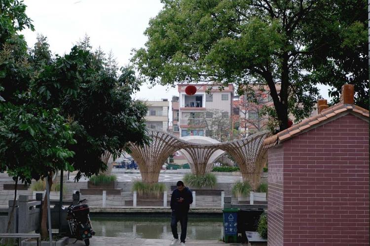 600年前的护龙桥静默不语,300年前的杜氏祠堂肃穆而立,黄龙村浓厚的历史质感穿过南安巷,与富临公园两座火红的雕塑交相辉映,历史与现实在这里巧妙交融。黄龙滨水竹廊2.0位于广东省佛山北滘镇黄龙古村。北滘,古称“百滘”,意为“百河交错、水网密集”。典型的岭南水乡内,滨水的灰空间气候适宜。在黄龙村,大大小小穿插在村子里的公共空间是黄龙村最具人气与场所魅力的活动场所。融合自然更成为居民们生活、闲聊与娱乐的亲水营地。