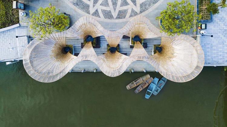 黄龙滨水竹廊2.0是长岐球场竹廊方案的延续,竹廊2.0再次尝试延续低碳自然的原竹材料的现代设计与建造,结合乡村传统竹编的手艺与美感,为滨水台阶提供一个悬挑无柱、视线通透、遮风挡雨、不影响活动的灰空间。