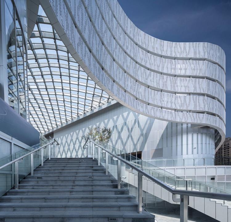 建筑师为这座文体中心设计了一层极具柔性、形似丝绸的外表皮,将两个相对独立的建筑单体包裹联结,并在中间聚合出公共开放空间。轻薄的金属穿孔板作为这层外表皮的主要材料,记叙着如今浒墅关经济开发区高歌猛进的时代性。柔韧的造型、细密而又轻薄的质感不难让人联想到闻名遐迩的浒墅关丝绸。现代性与在地性于此间寻求平衡,在城市文脉的彼此关照中成为可阅读、可识别的事物。