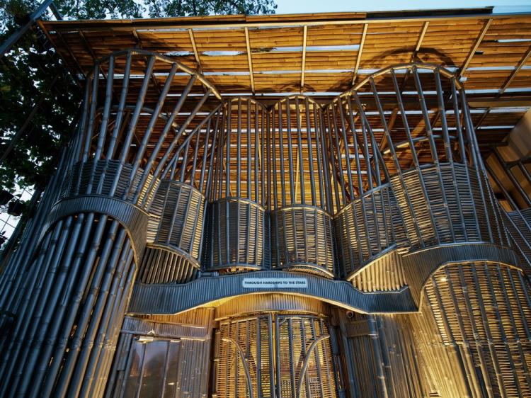 整个项目的建造是由来自西爪哇省(west java)的工匠所完成的,他们不光在竹结构的建造过程中使用了传统的鱼嘴节点,还尝试将现代的钢结构建造手法融入其中。