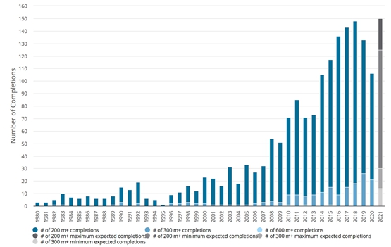 尽管总体高层建筑竣工量呈下降趋势,但CTBUH预计,2021年将有125至150栋超过200米的建筑竣工。