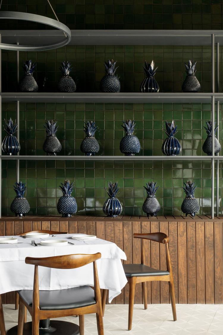 Santomate也将在其“蓝色房间”里接待客人,其中一个主要房间里有一个大型壁炉,覆盖整个木制墙面,对面的墙壁上装饰着五十多个釉面的菠萝形状的陶器和手工,它们出自San Jose de Gracia, Michoacan之手。