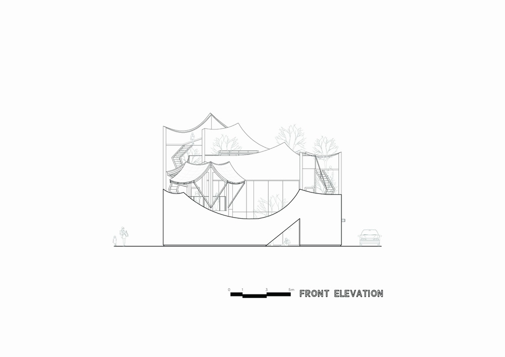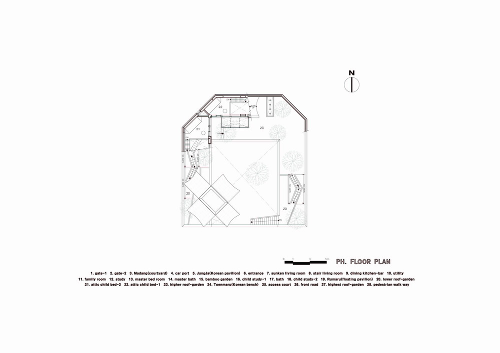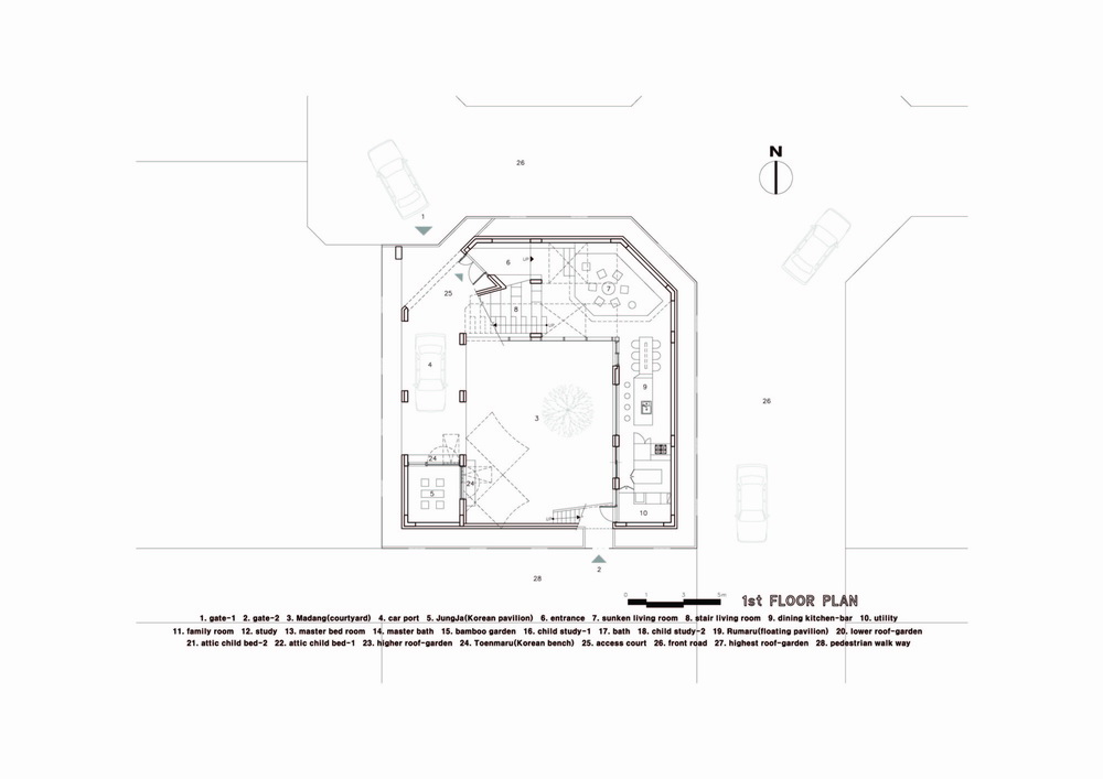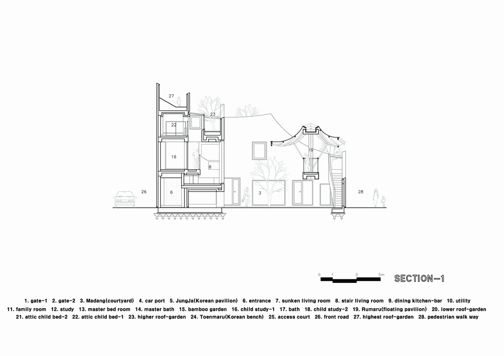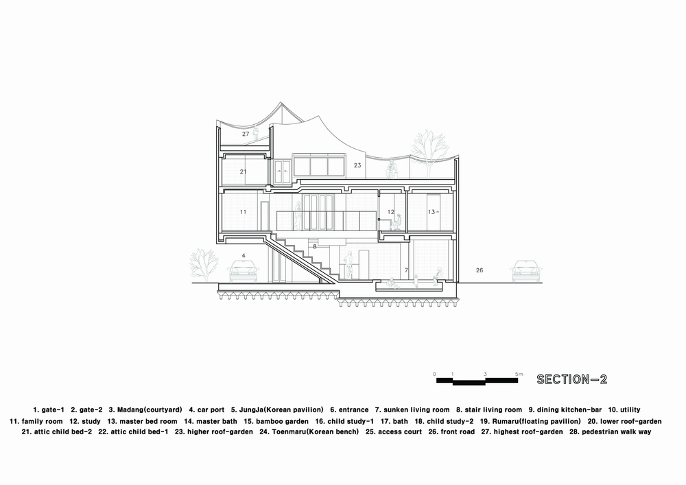 我们将韩国传统建筑师的院子、花园和观景台等空间和景观元素转化为当代住宅的设计思路。应用房屋的外部空间、绿化屋顶,因此当您从庭院走到屋顶时,它的斜坡形成独特的景观,