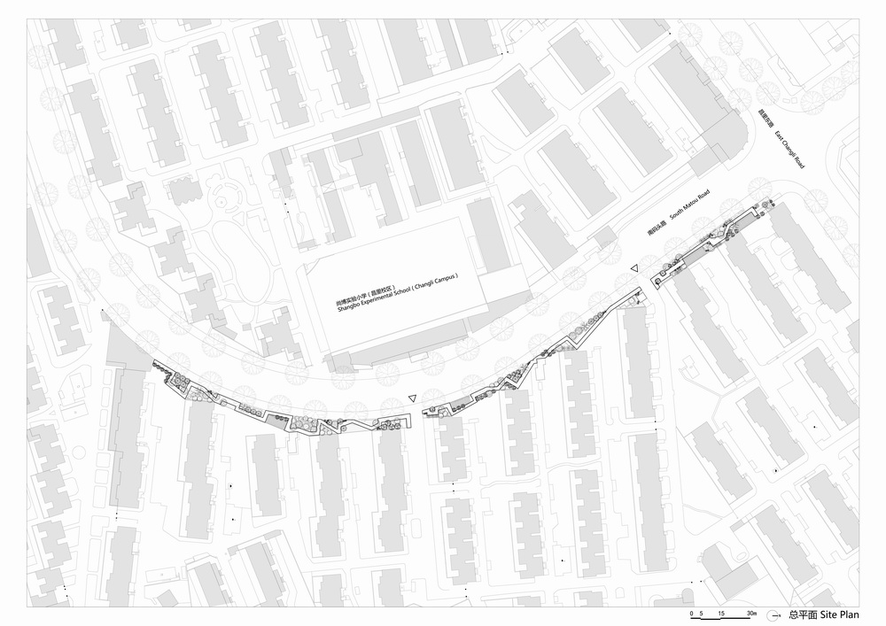周家渡街道位于世博园区的南侧,是一片高密度的生活街区,拥有许多非常典型的大型居住社区,呈半弧形延展的南码头路从其中穿越而过。2018年的拆违整治项目,将南码头路东侧喧闹杂乱的商业店铺拆除清理,在昌五小区的边界处留下了一段350多米长的圆弧形围墙绿地,面对城市形成了一道单调、冗长的界面,而在小区内部也留下一段段荒芜封闭的杂草丛生地。如何重塑这道城市边界,激发街道生活,便成为这个项目的迫切议题。