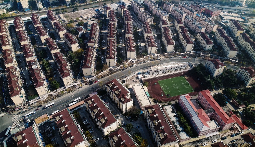 建造过程中的鸟瞰:游廊线型的选择是在与各种现状要素之间进行对话的过程中形成的,它不仅避让、结合了所有的现场树木,而且也包容了一些水泵房、配电箱等设施内容,同时也为街道上的公交停车站提供休息座位,为行人提供休憩区域,而游廊本身,也成为居民健身使用的步道。