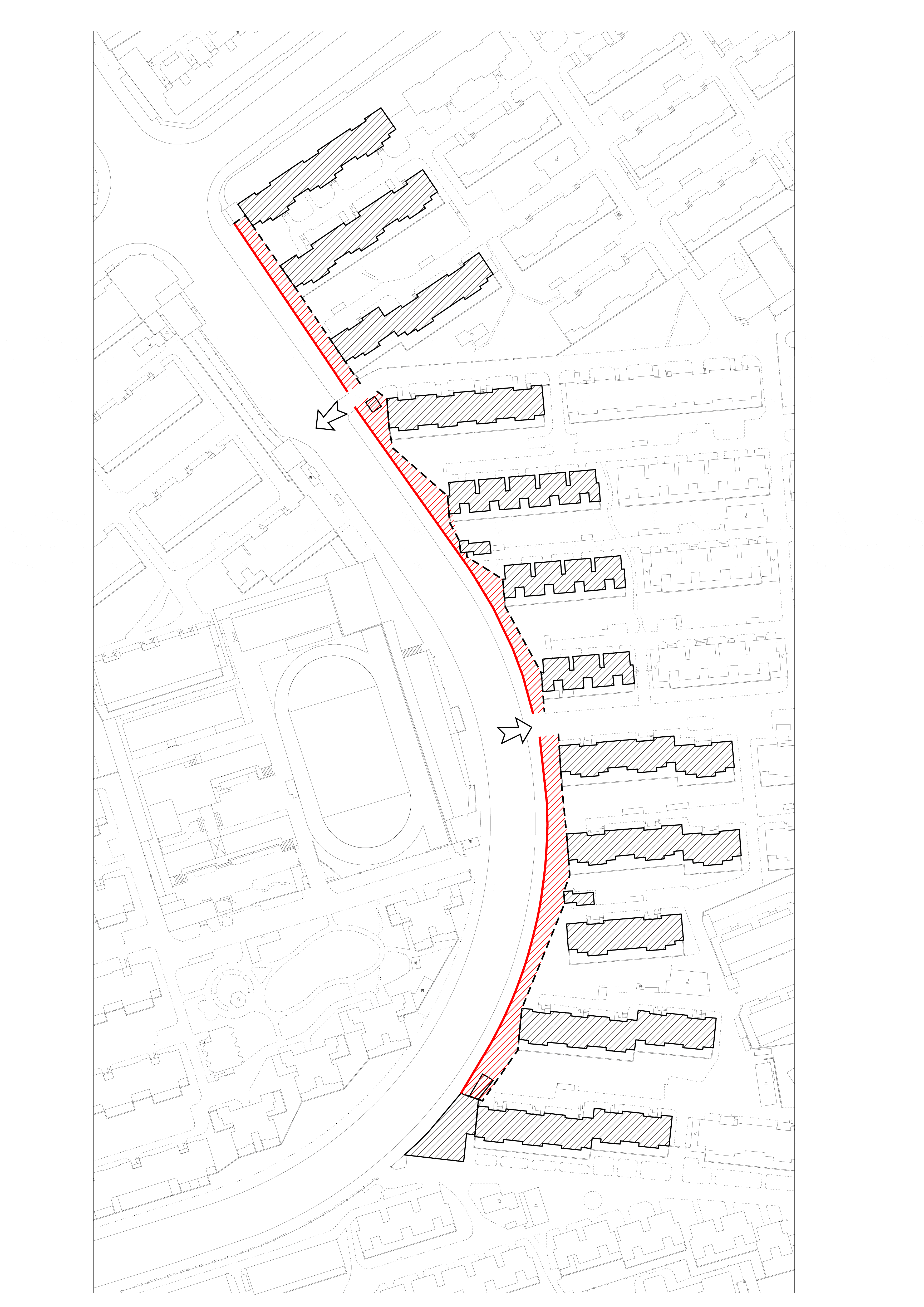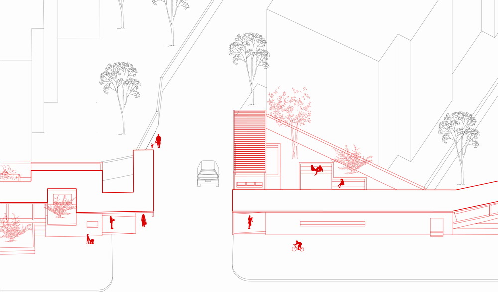 由于沿街店面的拆除留下内外侧双重界面,重新构想的曲折界线将场地分别与内部社区与外部街道的空间结合起来,根据场地的特定条件进一步调整的界线现状,并由此发展成为一条行走路线,最终形成的方案成果。