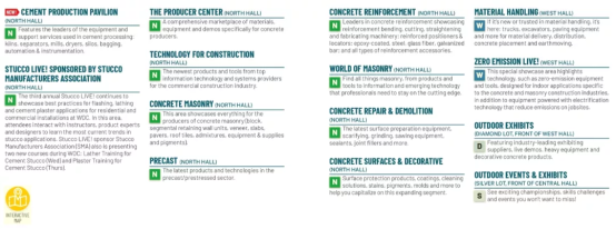 1500 参展企业700,000平方英尺展览面积60,000 观众点击链接查看WOC 2021展商名单:https://woc211.mapyourshow.com/8_0/explore/exhibitor-alphalist.cfm?nav=1#/点击链接查看 WOC 2021 展位图:https://woc211.mapyourshow.com/8_0/floorplan/World of Concrete美国混凝土世界博览会观众来自世界各地的超过60,000名建筑行业各个领域的专业人士:商业承包商,混凝土承包商,混凝土泵车,施工经理,经销商/分销商,混凝土装饰承包商,设计师和规格师,总承包商,砌块/细分部门生产者砌体承包商,建筑师,工程师,砌块生产者,预拌生产者,租赁设备中心,维修承包商,住宅承包商,特种混凝土承包商,预制件,管道和砌块生产者,预制/预应力生产者等等。2021年展区分布水泥生产馆(北馆)STUCCO现场演示(北大厅)零排放现场演示(西厅)制作中心(北厅)建筑技术(北厅)预制构件(北厅)混凝土砌体(北厅)混凝土加固(北厅)砖石及砌筑(北厅)材料搬运及运输(西厅)混凝土维修与拆除(北厅)混凝土表面和装饰(北厅)户外展品(钻石大厅,西厅前面)户外活动和展览(中央大厅前的1号和2号银牌)*您可在应用商店中搜索“WOC 2021”,或进入:https://www.wocasia.cn/wp-content/uploads/2021/05/Mobile-App-World-of-Concrete.html下载World of Concrete 2021 APPWOC APP 功能包括•展商名单•展厅平面图 •详细的活动、会议、演讲者信息•出版刊物•电子参观指南•最新的展会资讯参观指南PRE-SHOW PLANNER点击链接查看:https://www.wocasia.cn/wp-content/uploads/2021/05/pages.pdf访问World of Concrete 美国混凝土世界博览会官网www.worldofconcrete.com以获取展会的最新资讯!