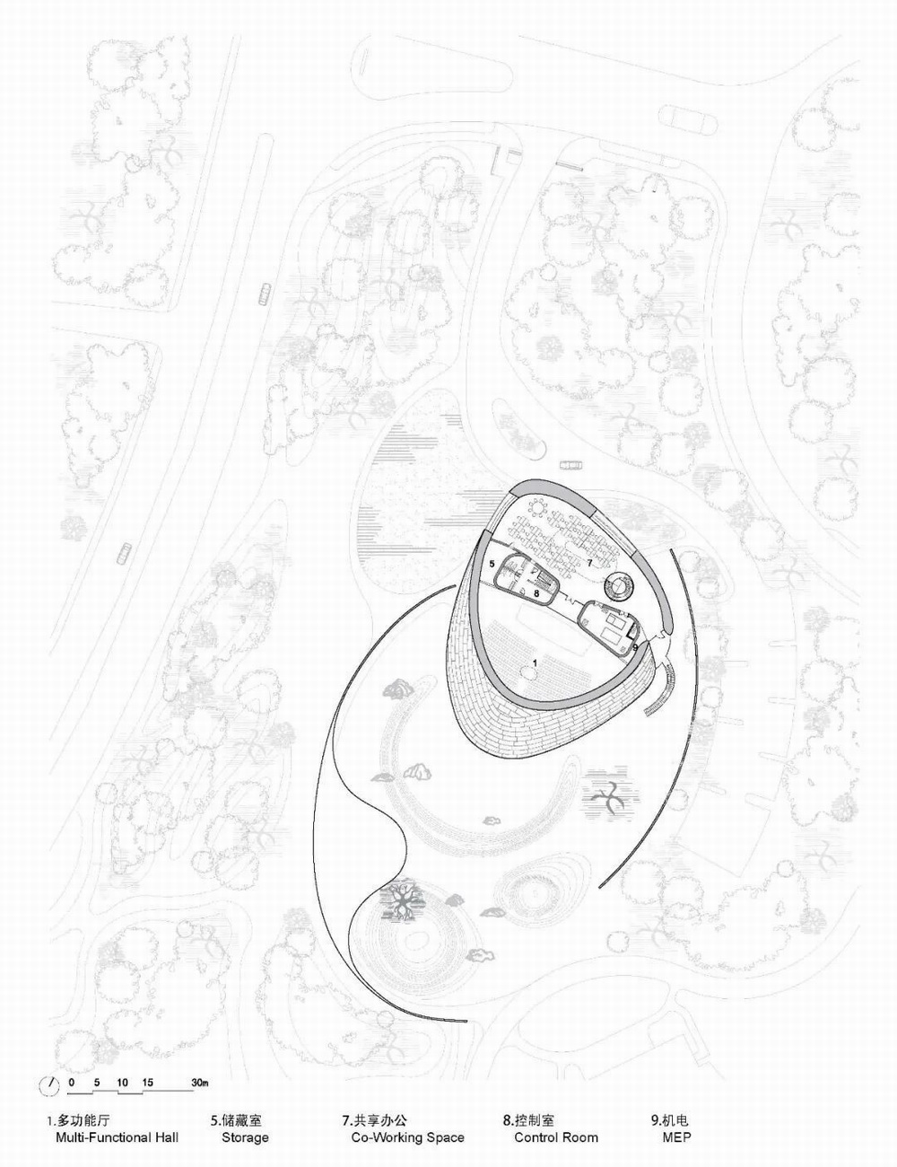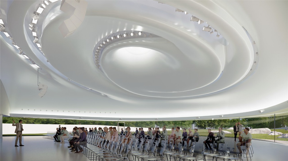 室内最为核心的多功能厅空间由旋涡般的吊顶向天空延伸。充足的自然光通过天窗直达室内,使建筑更加节能高效。开敞空间及可移动墙面为展览、戏剧演出、会议及发布会等不同活动提供了充分的空间弹性,满足多样化活动的需求。