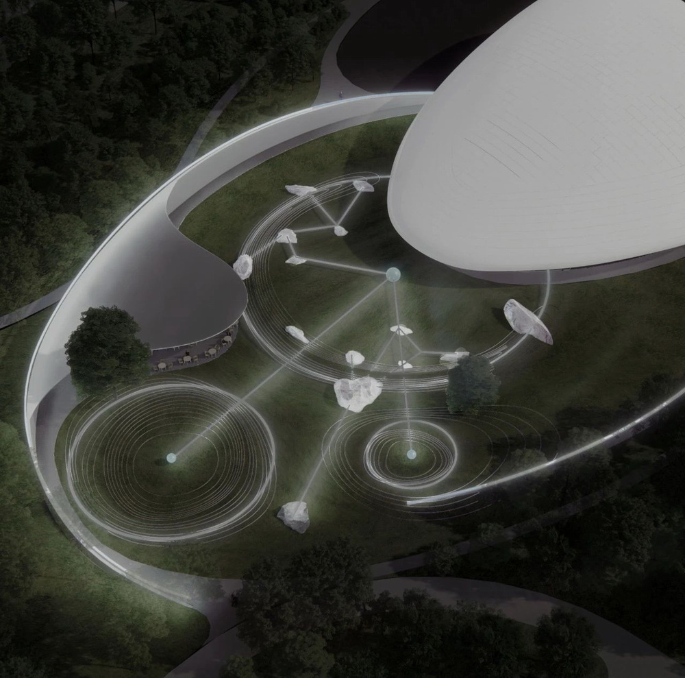 周边的庭院与“云朵”建筑悄然相依,低矮的环形围墙在内部营造了一种抽离现实的氛围。起伏的绿地和白色的岩石似宇宙中漂浮的星球。