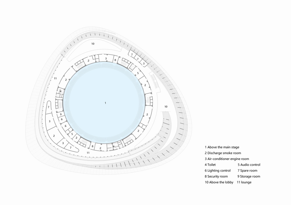 电竞馆体量由特殊的场地外部因素,“由外及内”地促使建筑逻辑的成型。建筑师引入“星际涡旋”的设计概念,延续基地周边三条主要步行路径作为“星际涡旋”的骨架,环绕核心旋转上升,形成建筑主体,宛如宇宙星云中的恒星,向星际空间抛射光明与能量。