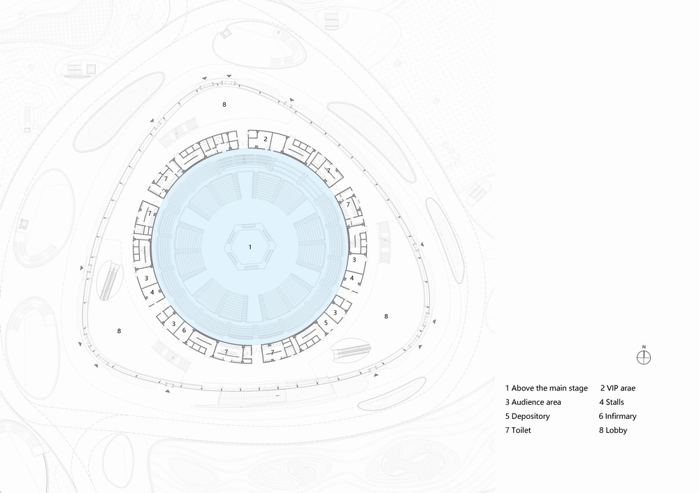 基地由城市道路、高铁线路以及高架快速路三面围合,周边交通异常复杂。电竞馆采用局部下沉的手法,将人流、车流通过立体的方式,从地下引入场馆,有效破解了周边复杂交通对场地的桎梏。