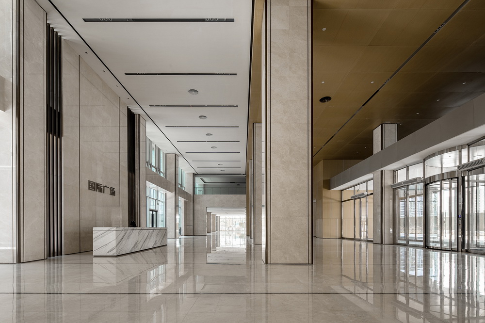弱化了裙房的概念,以此打破塔楼与基座相分离的传统布局,在项目高度有限的前提下,统一而整体的建筑体量有助于形成标识性。基座的中心体量被抽离,办公空间随之围绕中庭展开。下沉的水院,倾泻而下的自然天光为使用者创造了一个自然、生态、舒适的办公环境。