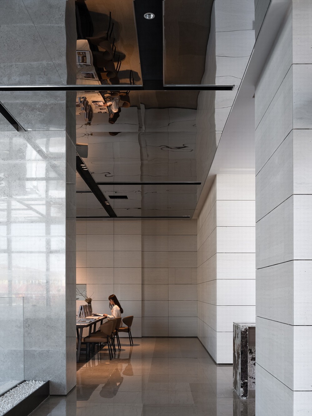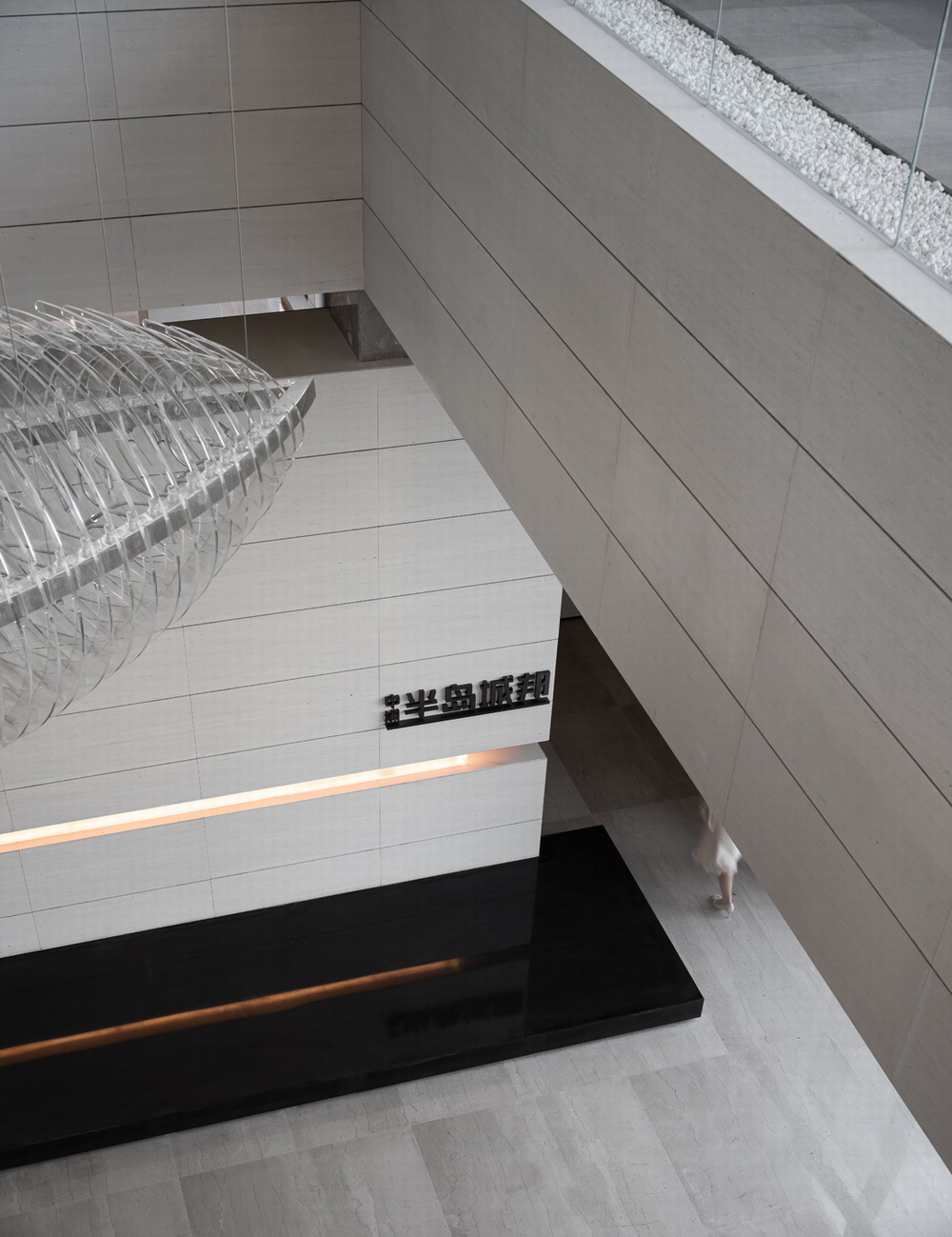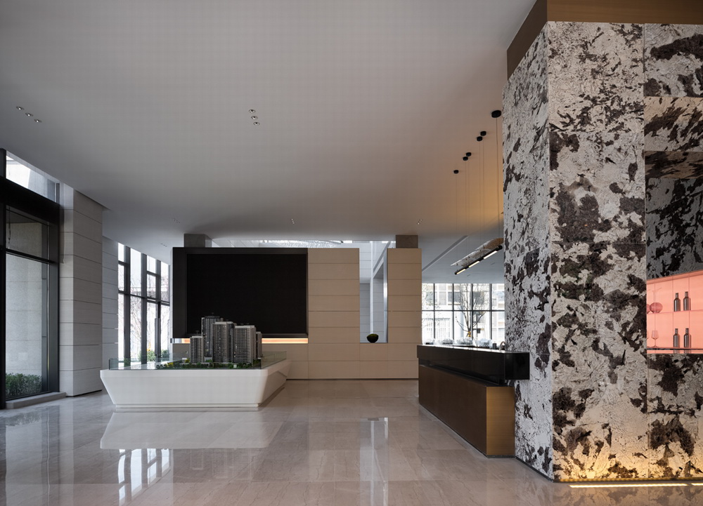 “对于售楼处而言,‘人’才是空间中最大的色彩,在硬装、软装的材质上颜色的运用都尽可能精简,以黑白灰为主,通过色阶变化、材质肌理、和结构组合去丰富整个空间的层次,提升空间的秩序。”设计师说道。