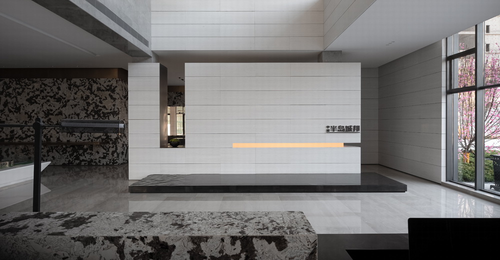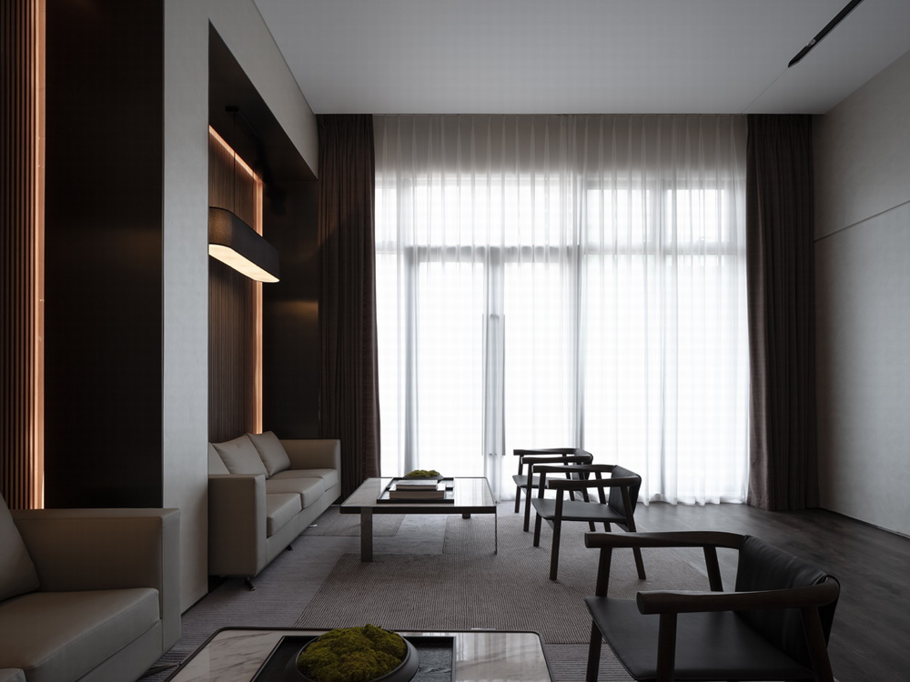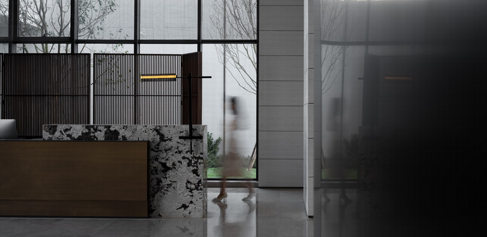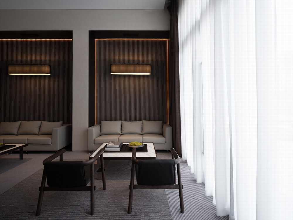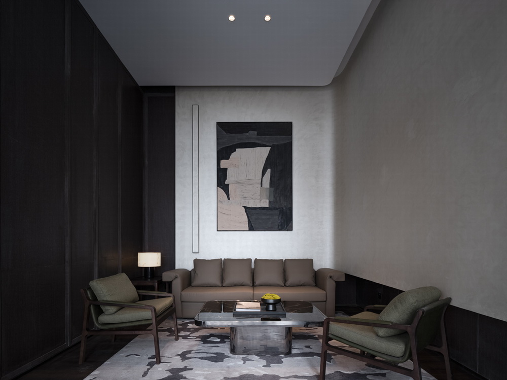 “对于售楼处而言,‘人’才是空间中最大的色彩,在硬装、软装的材质上颜色的运用都尽可能精简,以黑白灰为主,通过色阶变化、材质肌理、和结构组合去丰富整个空间的层次,提升空间的秩序。”设计师说道。