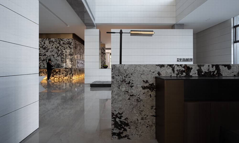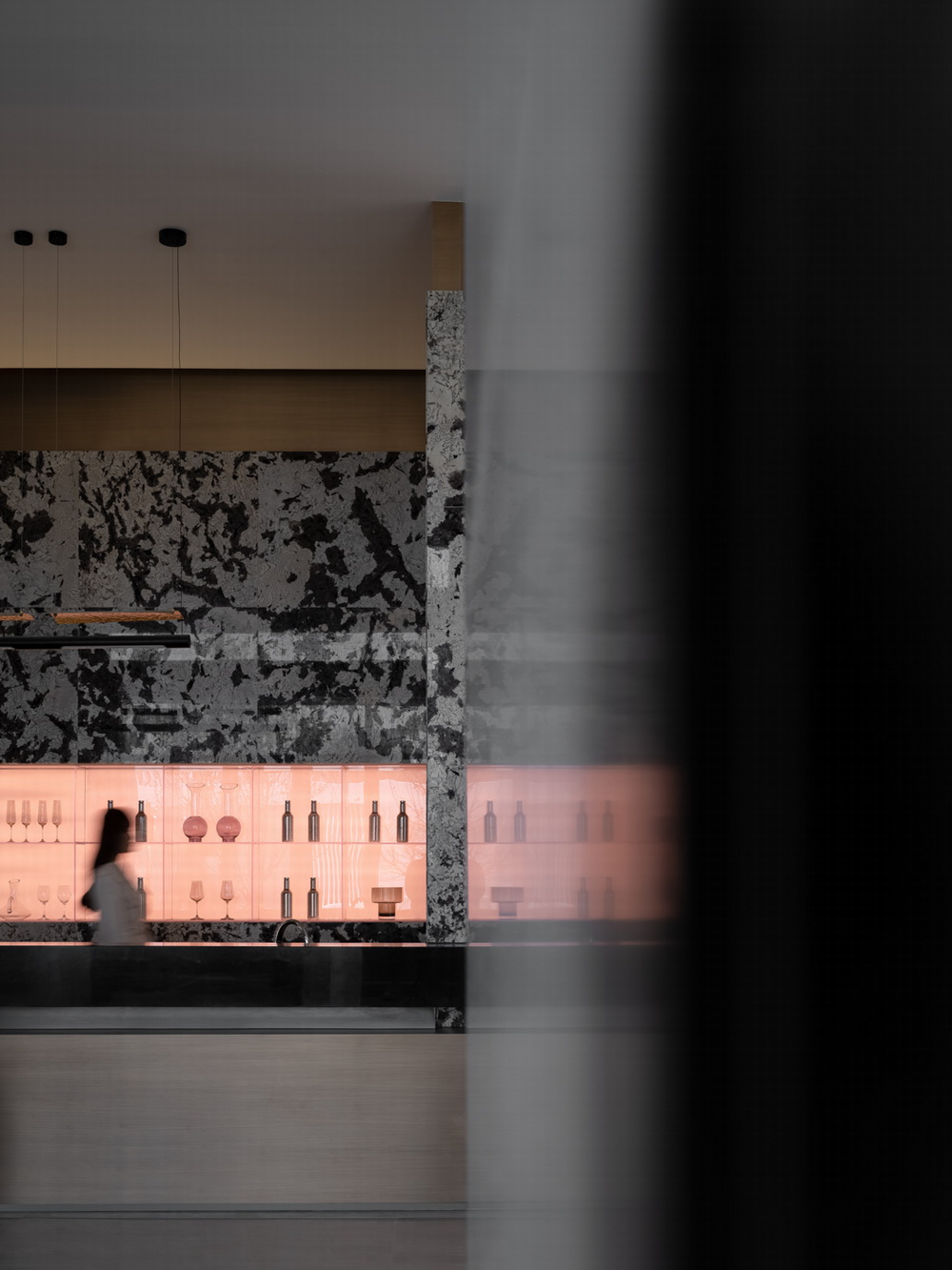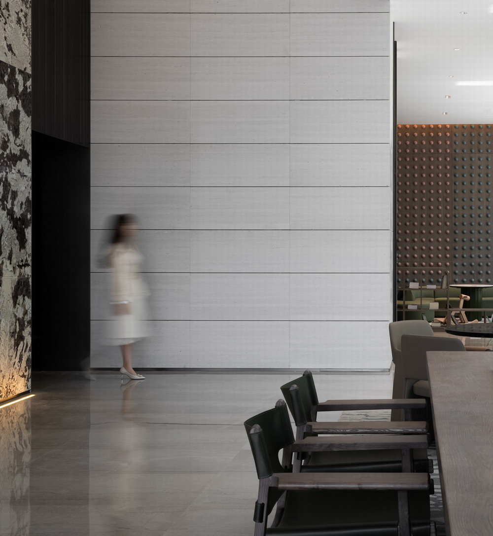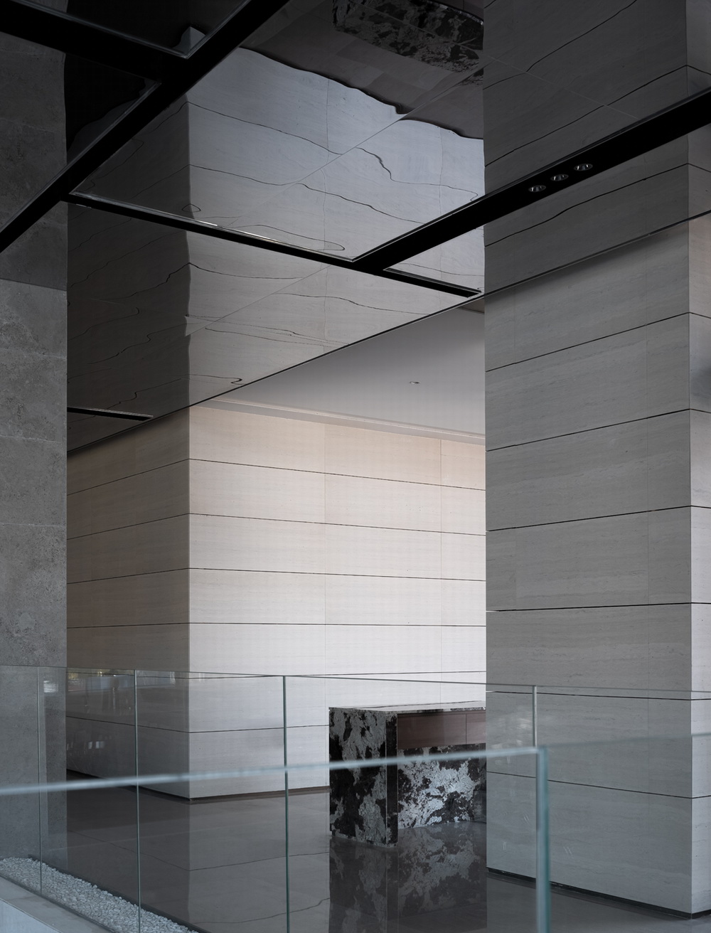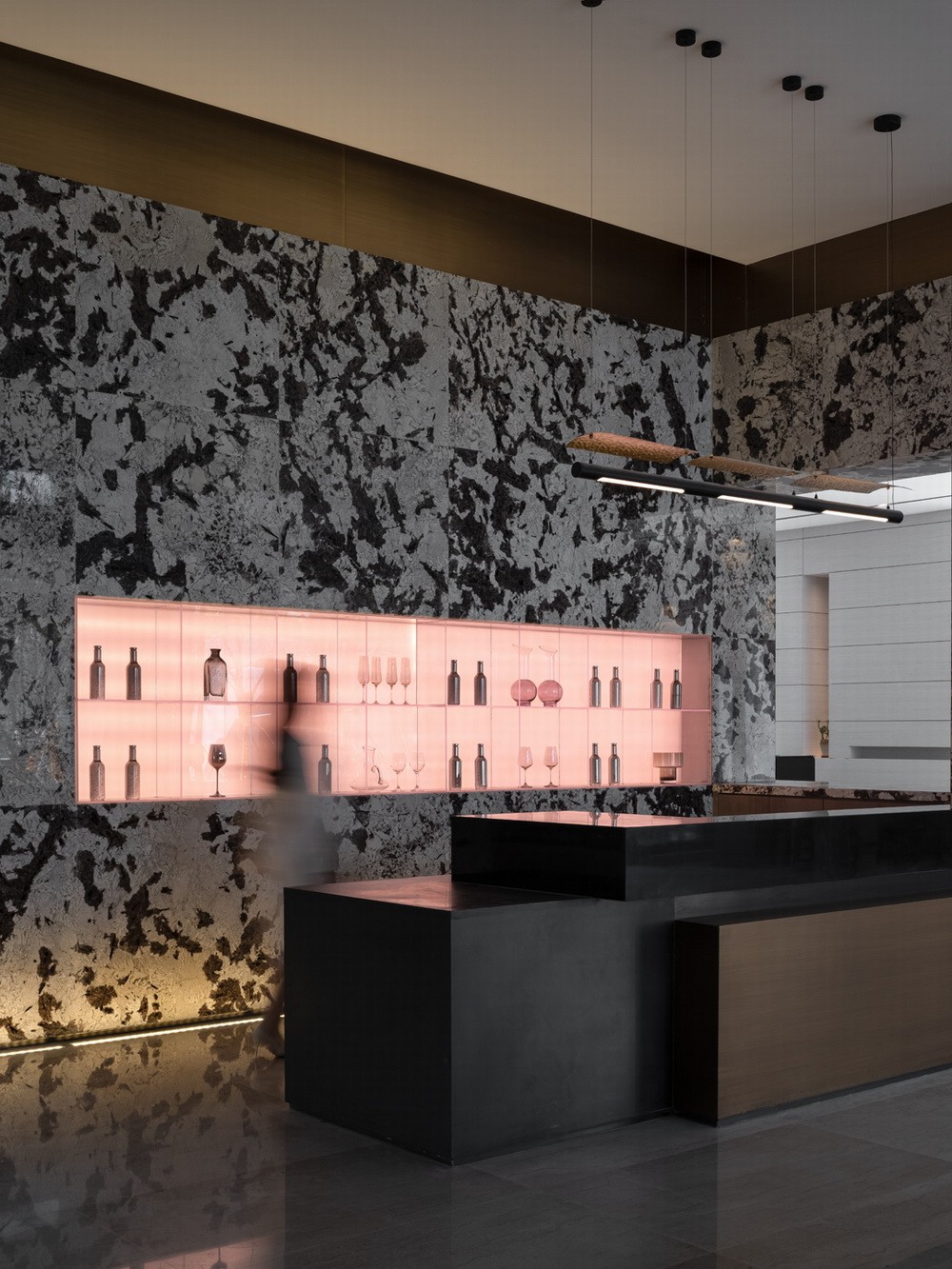 带有大胆纹路和强烈肌理感的石材在空间中或大面积伸展膨胀,直观地激发起人们对自然的联想;或局部点睛,活跃视觉节奏。整体间续贯穿后,给予空间沉稳又强势的张力。