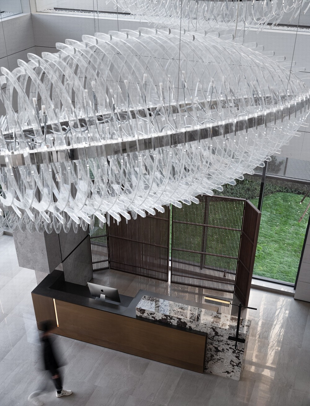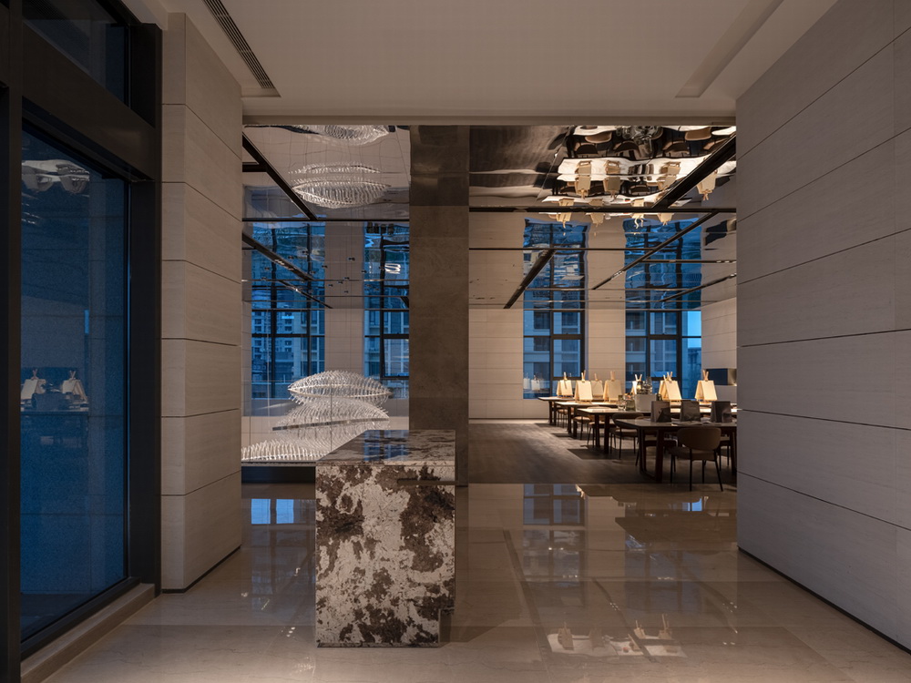 天花利用不锈钢镜面与时时变化的光线互动,表现出“水”一般的形态。艺术装置和沙盘模型的形制灵感都来自“帆”的造型,让美感与“启航”般积极上扬的气息兼具。