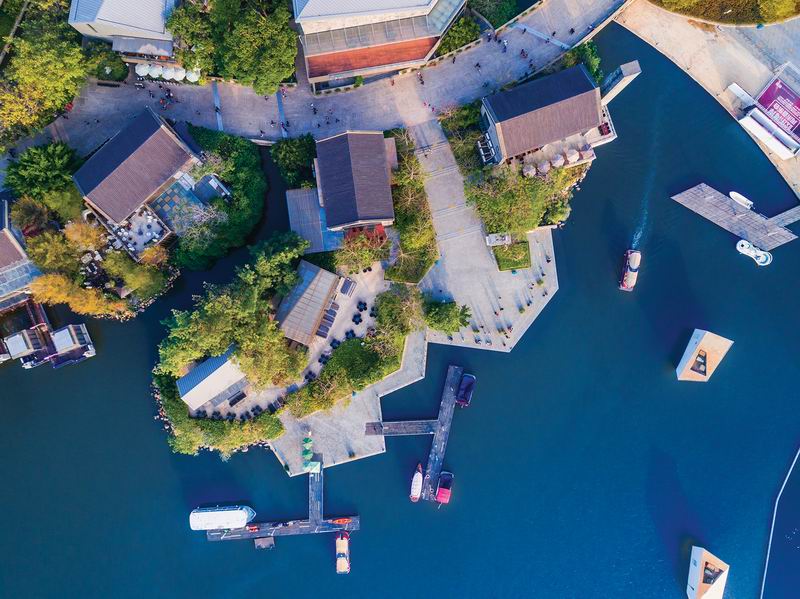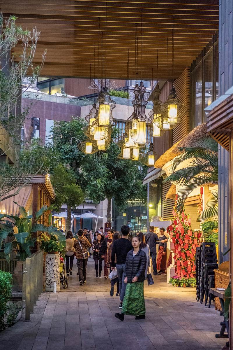 东区曲水湾区块的设计从中国传统水乡城镇中获得灵感。水道及其沿线建筑、空间、场地等的规划设计经过精心构思,结合商业业态营造出极为丰富的体验感。功能业态方面,东区包含精品酒店、餐饮、风情酒吧街、影院和舞台等。