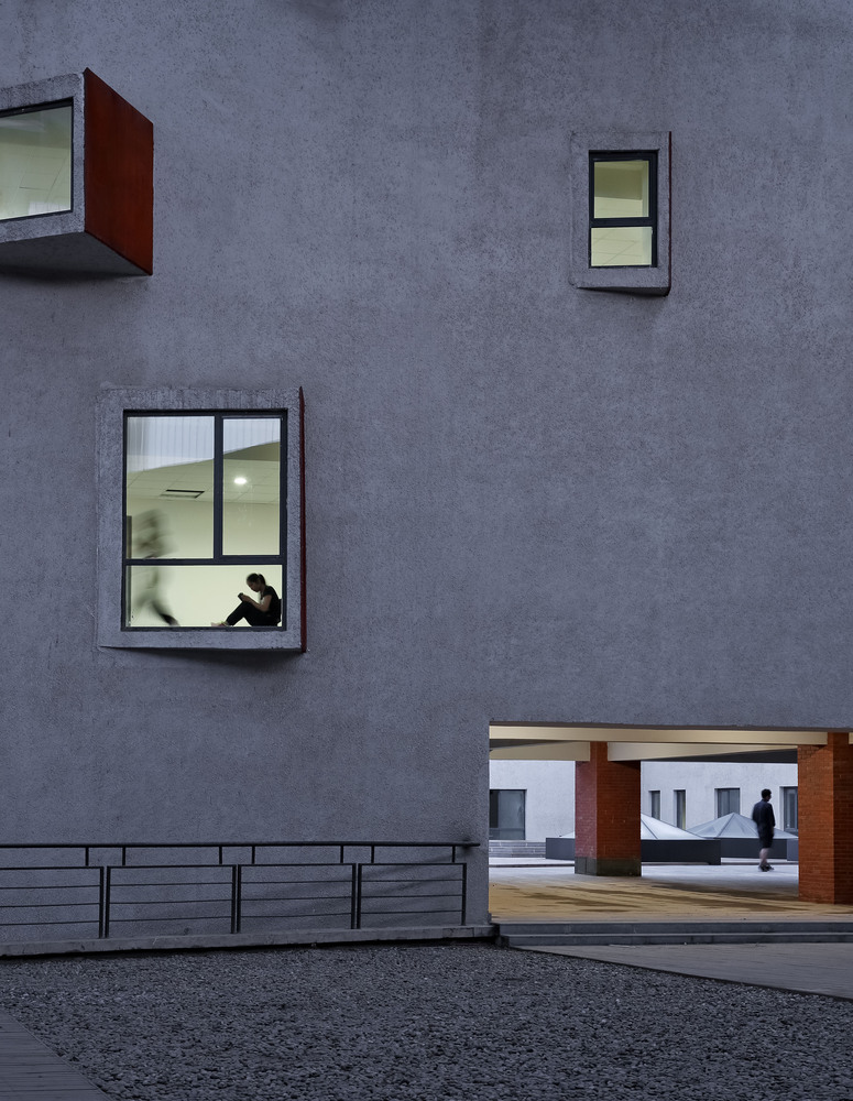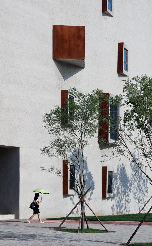 在立面语言和材料选择上,我们在沉稳的基调中求新意。对于分离出的“面”,我们将老校区最经典的理工学院大楼的立面简化提取,赋予朝向主入口广场的东立面,并按规划要求采用红砖材质,回应了师生们对于老校区的情感诉求。对于“体”自身的立面,基座部分也采用红砖材质,与分离出的“面”形成某种关连。其余大面则采用具有现代感的白色涂料,功能性开窗为主;采光要求不高的空间采用形式活泼的三角形凸窗,也成为容身休憩的场所和对外展示的“橱窗”。