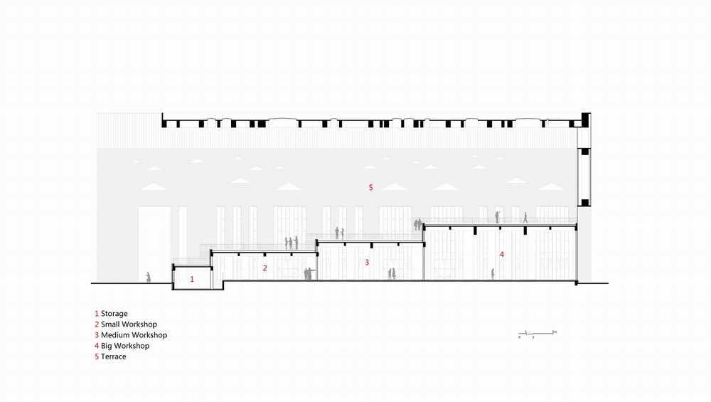 作为寒地建筑,如何激发室外空间活力是一个考验。我们在楔形灰空间上设置了满布三角形天窗的屋盖,免除雨雪之虞,也带来了丰富的光影。其中一个楔形灰空间位于两个方体之间,是穿行路径的一部分。另一个楔形灰空间位于北侧,与文创学院的大、中、小三个工坊在平面上恰好可以契合。三个工坊的屋顶形成叠落台地,作为师生作品的室外立体展场。在内院空间处理上,我们将大报告厅设在六层庭院的底层,将活动平面抬升至其屋顶,此举使庭院深度减小,增加了日照。同时,庭院与最高的台地相通,形成从内院穿过叠落台地到达地面的路径,以可达性激发空间活力。
