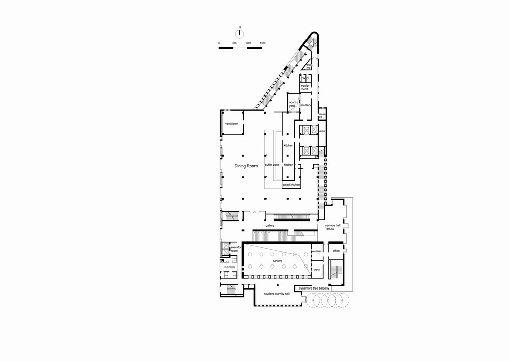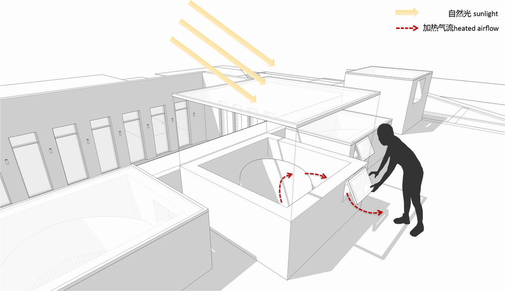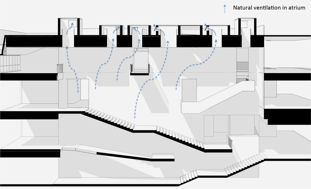 可持续设计策略,尤其是与建筑空间结合的被动式设计策略,不仅让校园建筑室内空间舒适怡人,更降低了建筑的造价与运营能耗。建筑的地上部分借由公共中庭,被分为独立运营的餐厅区与就业指导中心。中庭内的立体街道衔接了两功能区的各楼层, 如同共享的内庭院。顶部7个蛋形天窗,为室内带来充沛的自然光, 每个天窗顶部侧壁设通风口, 以便三层通高中庭内夏季热压及风压通风。为中庭引入自然光影的同时, 避免了夏季过热的问题。