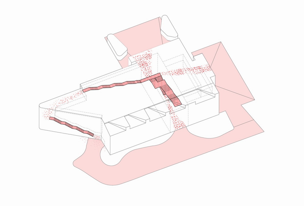 场地内的原始地形、西北角标志性的绿化草坡、东南角的悬铃木都在建筑和场地设计中作为文脉的延续被保留和尊重。为保留东南角的悬铃木,建筑在体型上做了退让处理, 在首层设置树下咖啡平台,在二三层设置观景阳台, 让人们更好的享受保留的绿色校园的怡人环境。