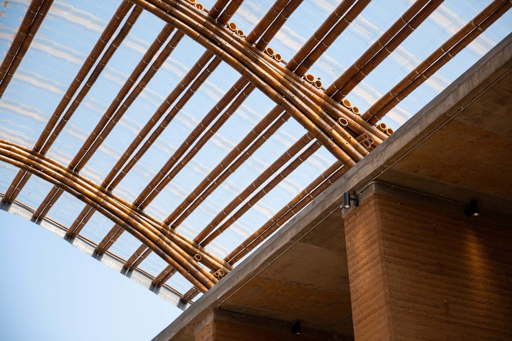 为了最大限度降低建筑的环境负荷,本项目中高达89%的建筑材料(按重量计算)是来自当地的原土、砾石、砂等自然材料。生土中没有添加工业稳定剂,100%可再利用、可降解、无污染。屋顶采用了速生的竹材。建筑的内外墙面均无装饰装修。水泥、钢材等工业材料只使用在了构造柱、圈梁、楼板等必要的结构关键部位。