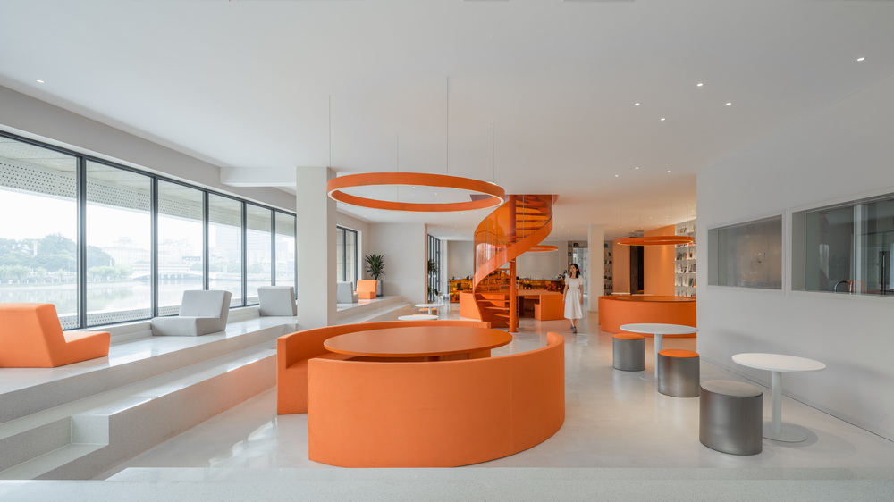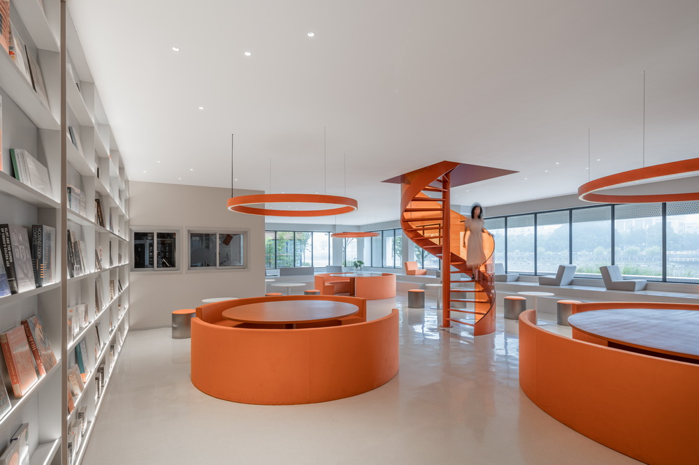 我一直着迷在场所中通过方向和视觉的复杂组织来创造时间体验,相对的快与慢。迷宫是一个极好的建筑类型结合光线能够达成这种体验。于是书架和家具成为书店迷宫的墙。透明和半透明的界面模糊了光线的明确性,让人在空间中产生迷惑和充满好奇的不确定。以至于时间在这里似乎有些慢。意外的是在咖啡区(榭),橘色的家具更像涟漪。而在临窗的高台上沙发上发呆,江水水平如画卷展开,一种中国画形成的时间观意外的复生了,吻合了我第一次站在江边时的那个情绪。