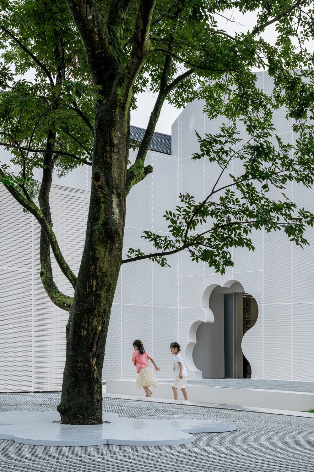 云具有一种复杂的纯粹美感。我不对拼贴的杂乱的商业地域性立面做整容手术,而决定连续的白色穿孔铝板墙将其包裹起来。连续的白色在江畔形成了一个复杂而纯粹的界面(通过控制穿孔率,立面上会形成云雾缭绕的层次)把书店藏起来了。铝墙是立面,也可以剥离立面成为庭院的围墙或者两者兼顾。连续的白色铝墙是用做加法的方式创造了一个宁静而宜人的视觉减法。一朵云升起在江畔,书店的读者就在云中了。