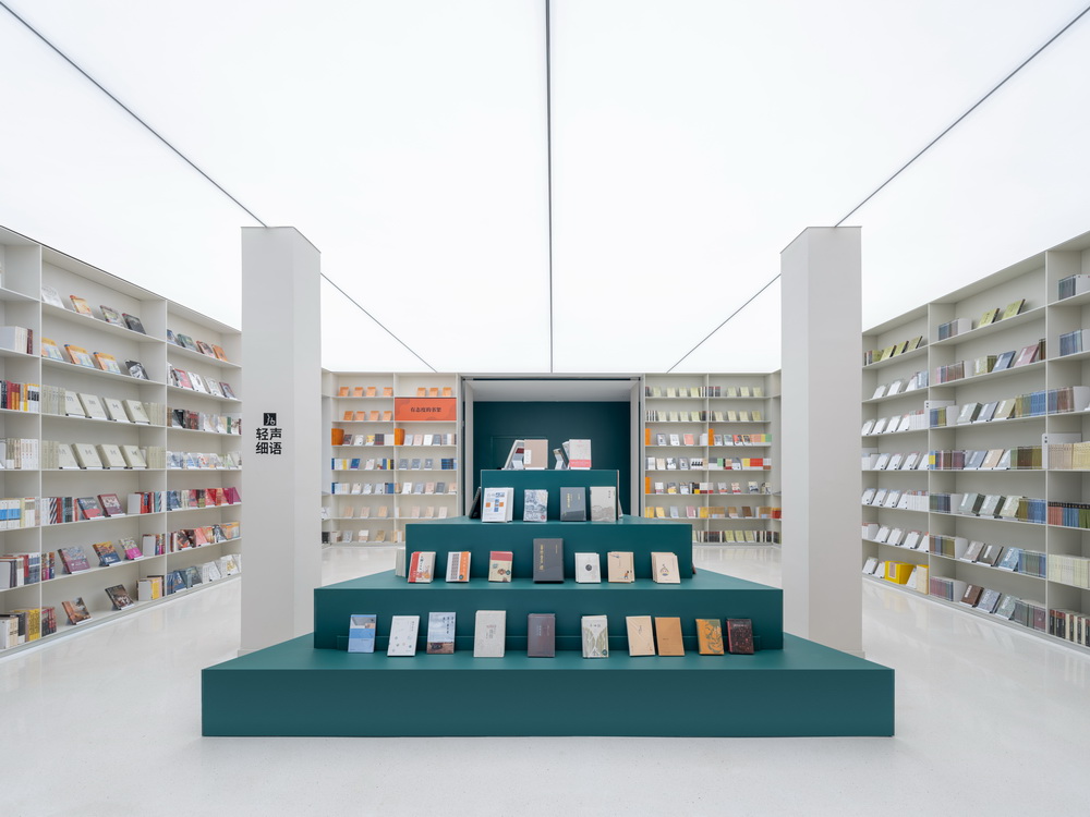 西侧加设了室内过道通往1号楼。这个过道被设计成展廊(廊)。1号楼首层是书店区域,入口是朵云特有的有态度的书架区(亭),转过向北进入书店主陈列区(堂)。经过收银台进入利用过道设计的阅读区(居),其后就是文创区(斋)。