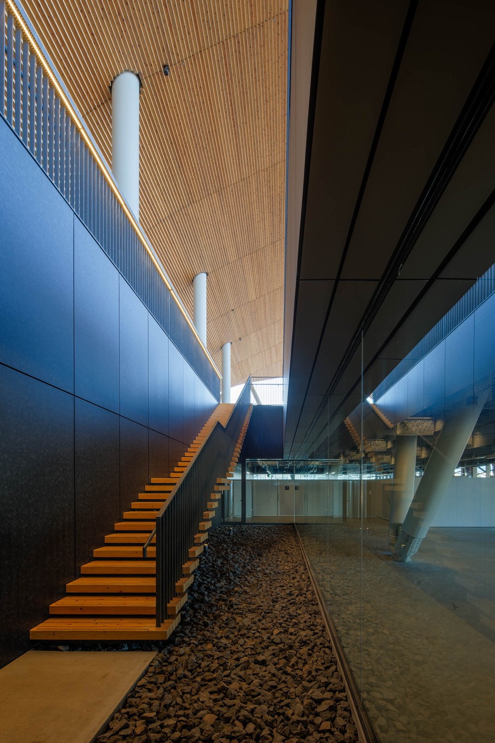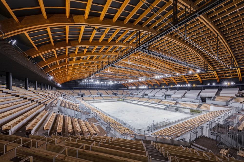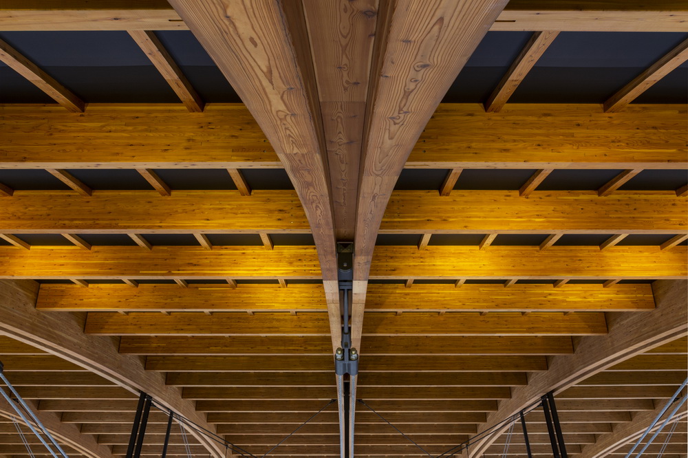 90米大跨度拱形木制屋顶因为项目场地土壤的承载能力不佳,所以我们采用了轻质的木结构屋顶,以减小建筑整体的重量。在本项目中,我们没有采用由许多小直径木材结合在一起的桁架结构,而是采用了高热容量的一体式层板胶合木作为屋顶的组装构件,以同时兼顾耐火性能与结构的稳定性。有明体操竞技场的这一复合式结构体系(木质张弦梁结构和悬挑桁架组合),成功地实现了大面积覆盖馆内空间的要求。