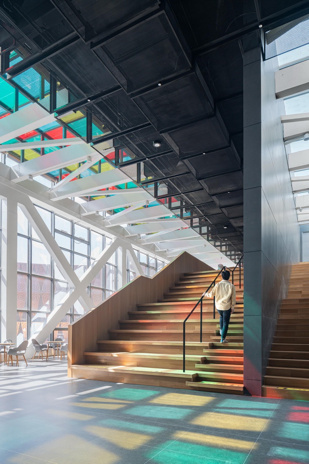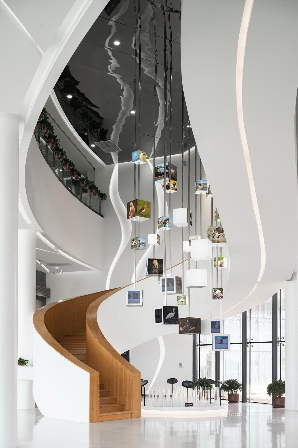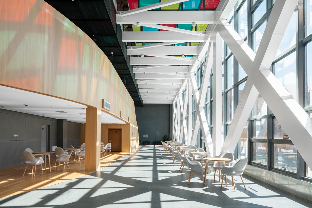 建筑公共空间借助天然采光、彩色光伏走廊、异形的主楼梯形成戏剧性的建筑空间。展厅与自然山水景观有对景的视线联系,使得湿地公园广阔的山水成为博物馆最壮观的展品。