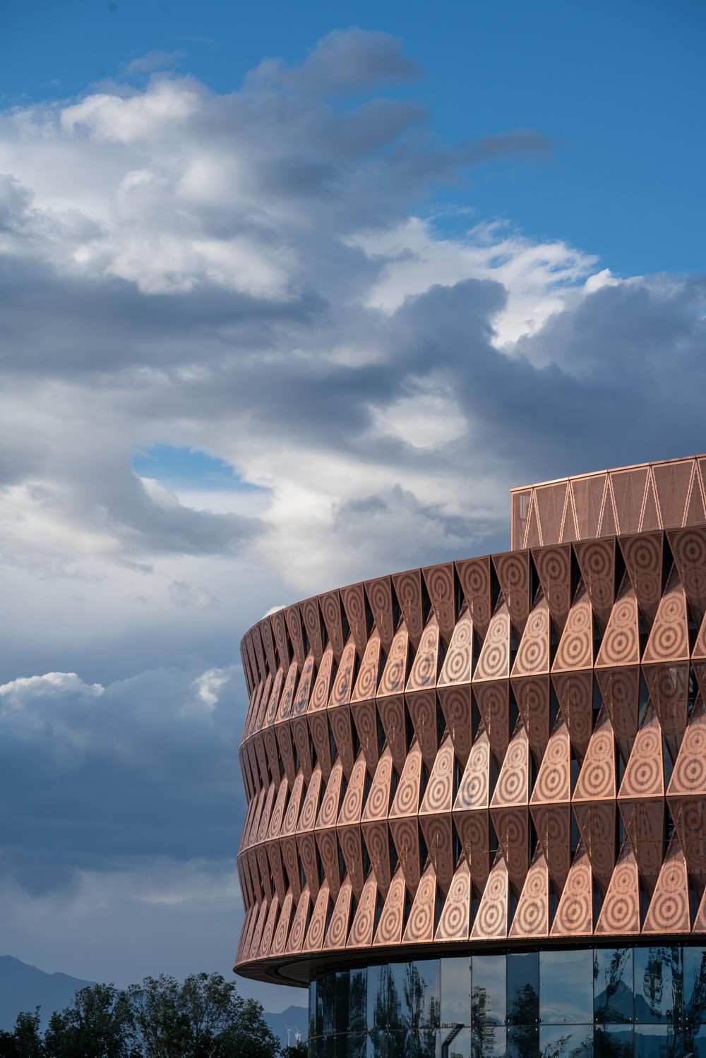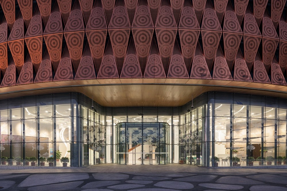 钢结构预制装配式体系采用了标准的表皮单元,建筑表皮设计为涟漪图案的铜板,并将随着时间从金黄色氧化为铜绿色,与环境融为一体。