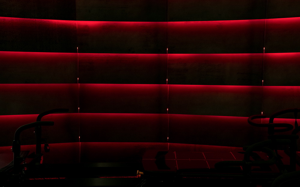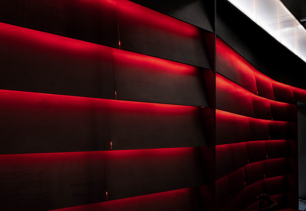 利用热轧钢板的质感和加工工艺特点,使其上下错落,覆盖于弧形墙面,形成散热片与出风口的形态,钢板内部隐藏红色线性灯烘托具有热量的视觉语言,凸显工业元素和电气化的风格。