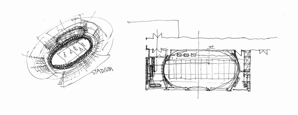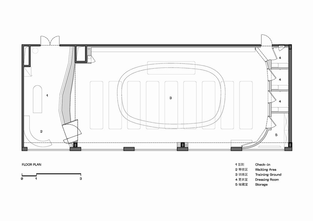 设计师将空间分为前中后三个功能区域,即前区为签到区域,中间为核心“能量场所”的训练区域,以及后区的更衣后勤区域。在保留原建筑钢结构屋顶形态的前提下,利用两段弧形墙面,形成一个向心的时刻散发生命力与热量的运动场所。