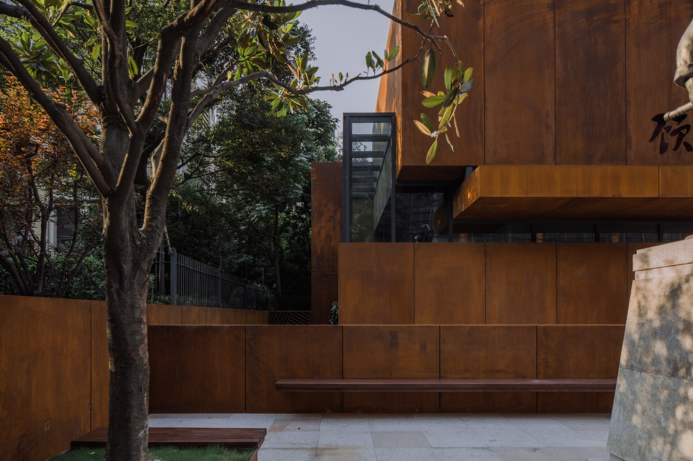 新馆造型,采用了耐候钢板塑造的一组错动的立方体组合,利用结构内退四面悬挑的方式,既强化了体量的沉稳刚毅,又表现了形体组合的错落灵动,与红锈色的质感共同隐喻了党领导下的中国工人运动的曲折、壮烈与坚毅。