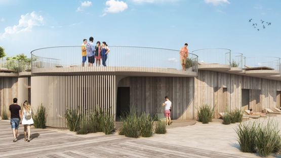一家餐厅将是开发项目的一部分,建筑由伞形混凝土柱支撑,楼顶兼作高架泳池平台,可通过各种楼梯到达。更衣室、专用小屋和室外沙滩健身房将位于私人地段的较低楼层。