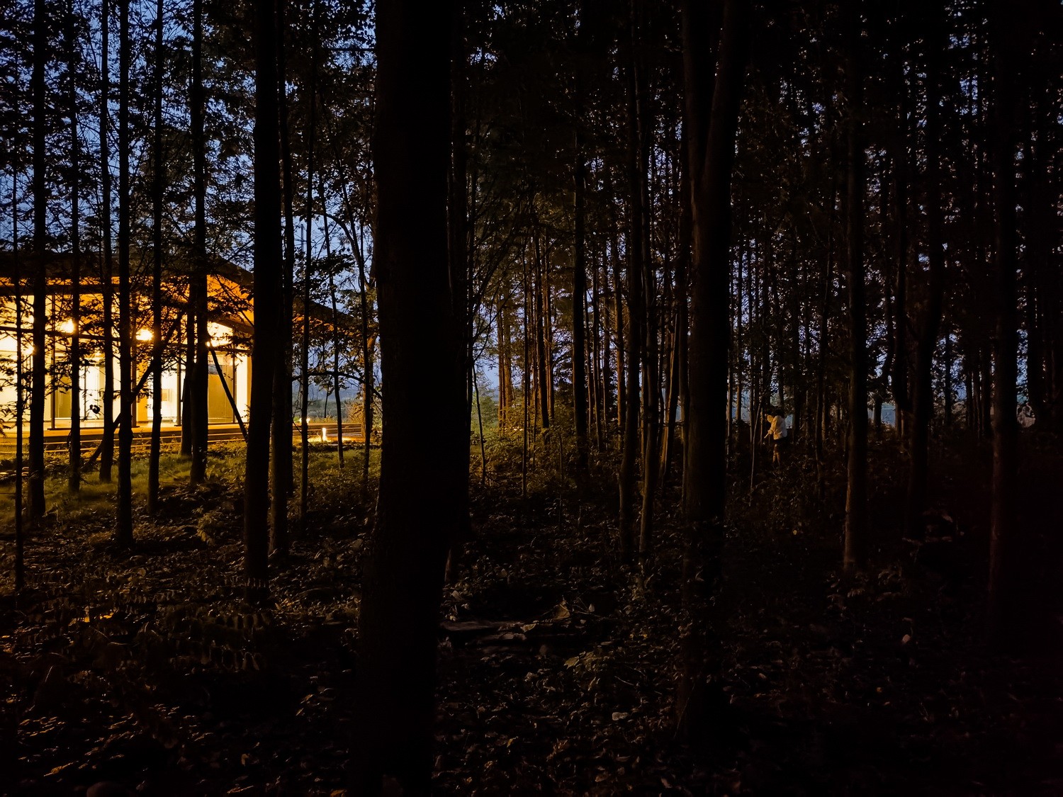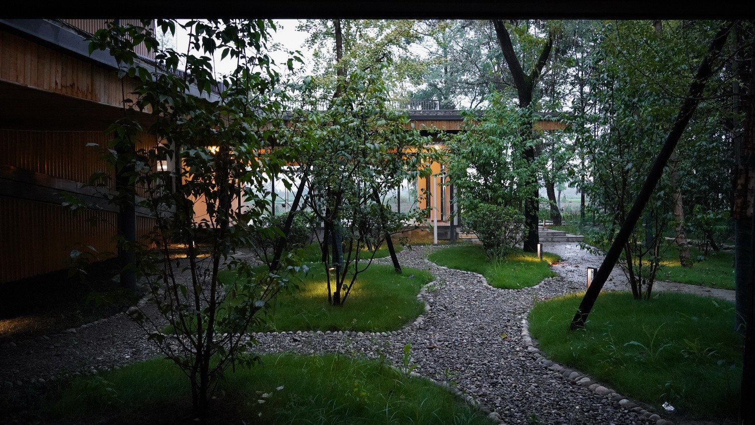 场地原有的树木保留下来和建筑围合而成大小不一的四个院子,树木和院子相互渗透,营造出林中有院、院中有林的场所意境,“林在田中、院在林中”的经典川西林盘意象在这个场所中尽显。