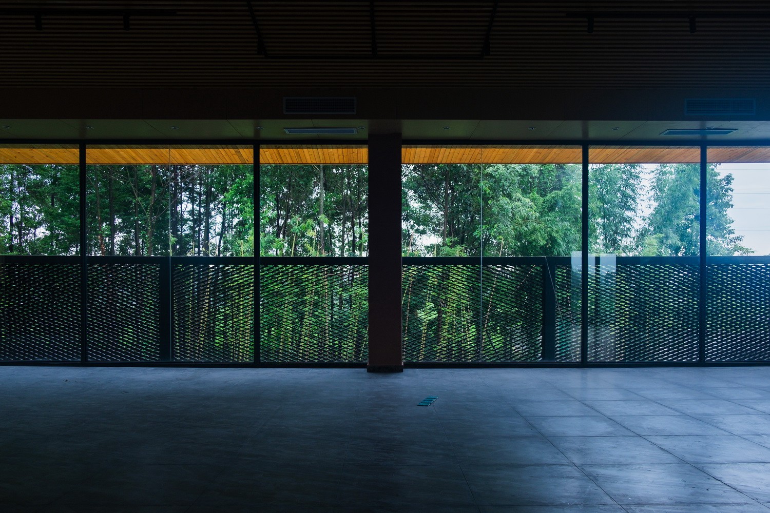 五个独立空间由一条坡道主轴和外部环廊串联在一起,靠内紧贴坡道和挑廊的外墙均为实墙,靠外能看见树林、稻田的外墙均为全落地玻璃,形成内实外虚、抑扬顿挫、移步换景、私密独立的组合空间。乡村里很多公共建筑在后期都存在各种各样的经营问题而导致建筑被闲置荒废,展示中心的设计我们提前预设建筑更多功能、运营、拆分的可能性,确保它出生后能够茁壮成长,被大家喜爱并乐在其中。