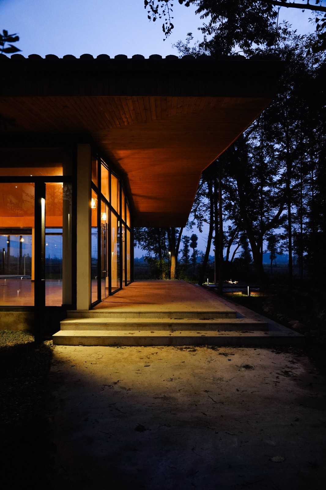 青瓦、白墙、木头、长出檐、天井是川西民居最常见的元素,我们将弧形坡屋顶和全落地玻璃的现代元素与之结合,成就了一个开敞通透、轻巧自如、朴素淡雅、田园诗歌式的诗意场所。