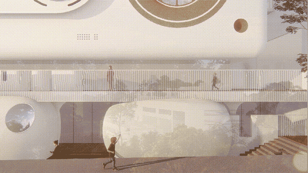 位于主体教学楼一层的漫步空间,化身结构多变的「游戏泡泡屋」,足以满足孩子们的好奇心和冒险心,在奇趣之间增加一份灵动。让上学这件事从进入校园那一刻起就有趣起来。「泡泡」的概念不仅体现在小体量的游戏屋,而是渗透于整个项目的建筑设计之中,不论是弧形的墙体线条,还是立面上大小各异的「平面泡泡」,都希望通过整体输出,打造一个充满互动的童趣空间。
