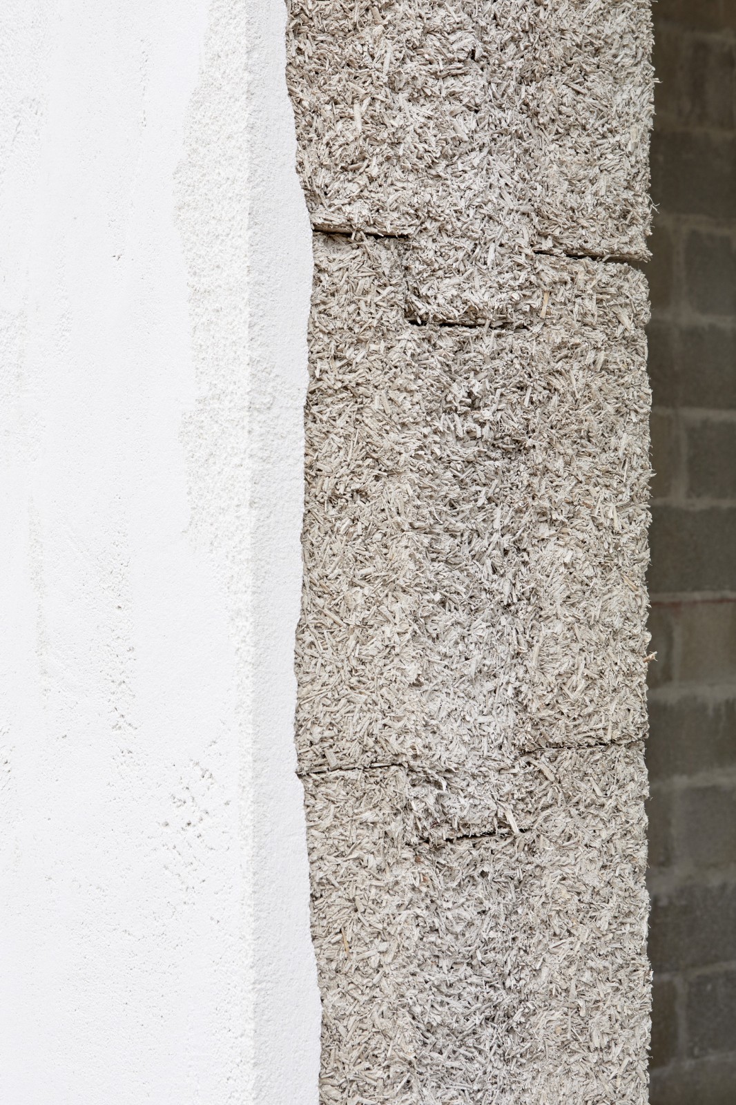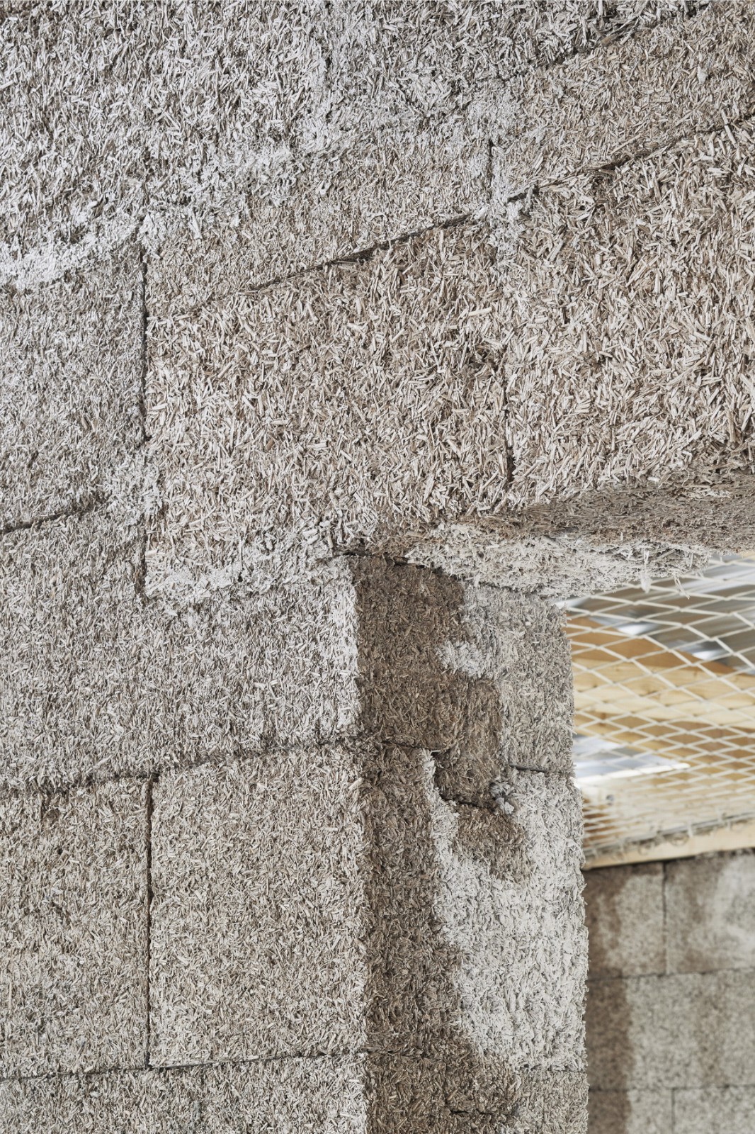 目前,大麻主要用于独立式住宅,通常在外部采用石膏饰面进行处理。在本项目中,为了便于维护,外立面由可以被单独更换的面板覆盖。内表面的下部用石膏对大麻材料进行处理。上部的大麻混凝土块被暴露在外,以此保留其良好的声学性能。