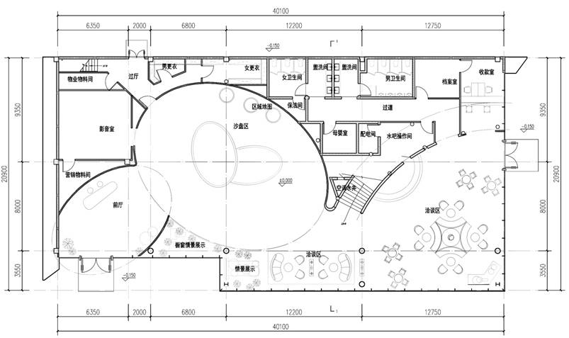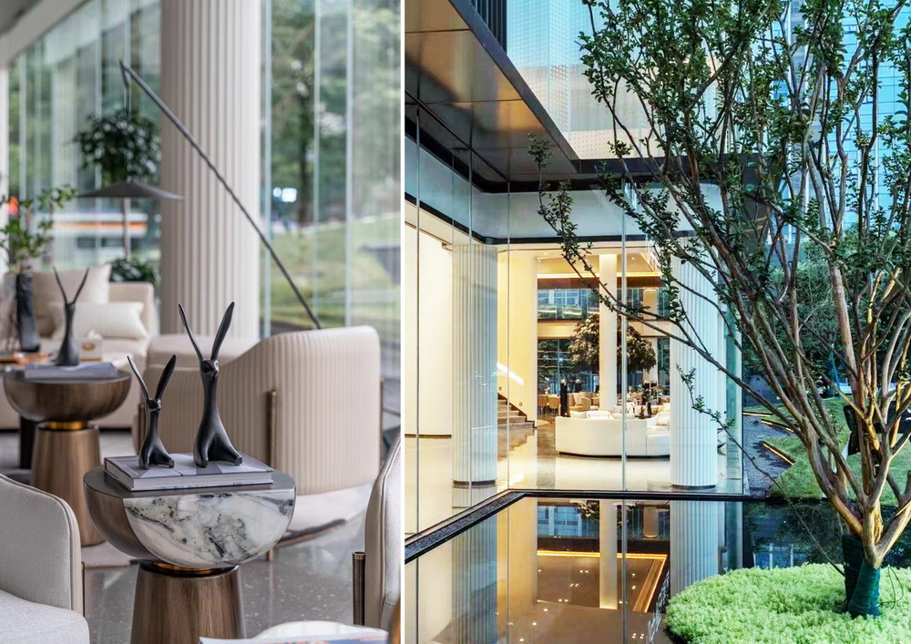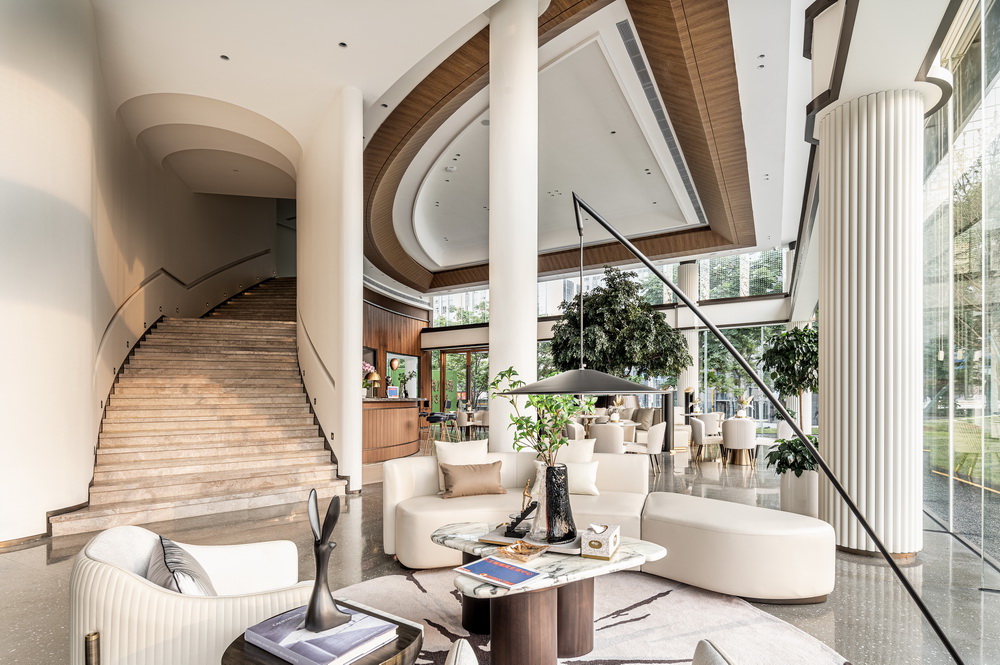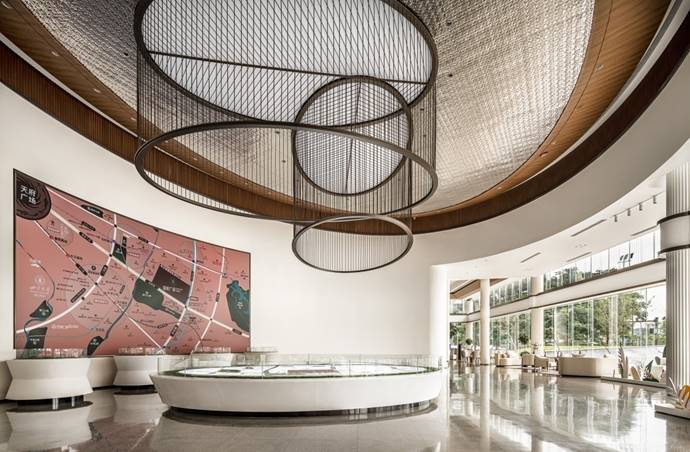 营销中心作为项目的展示区,我们希望能提供一个沉浸体验的动态感官,承载视觉艺术的展示空间,入口广场引入,灰白渐变的铺装引导,拾级而上的景观楼梯引人入胜,景观楼梯两侧水景犹如都市田园,由大入小的空间体验,再到宽敞的大厅、舒适的洽谈区,山水诗意的空间启发人们对理想生活的美好期望。