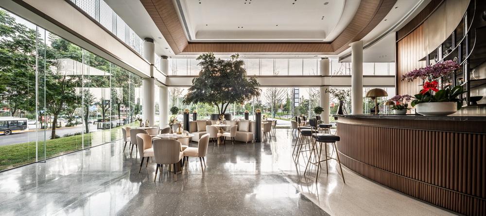 竖向深褐色金属杆件与横向杆件呼应,隐而不透,虚实对比,形成线面构成的独特空间魅力。