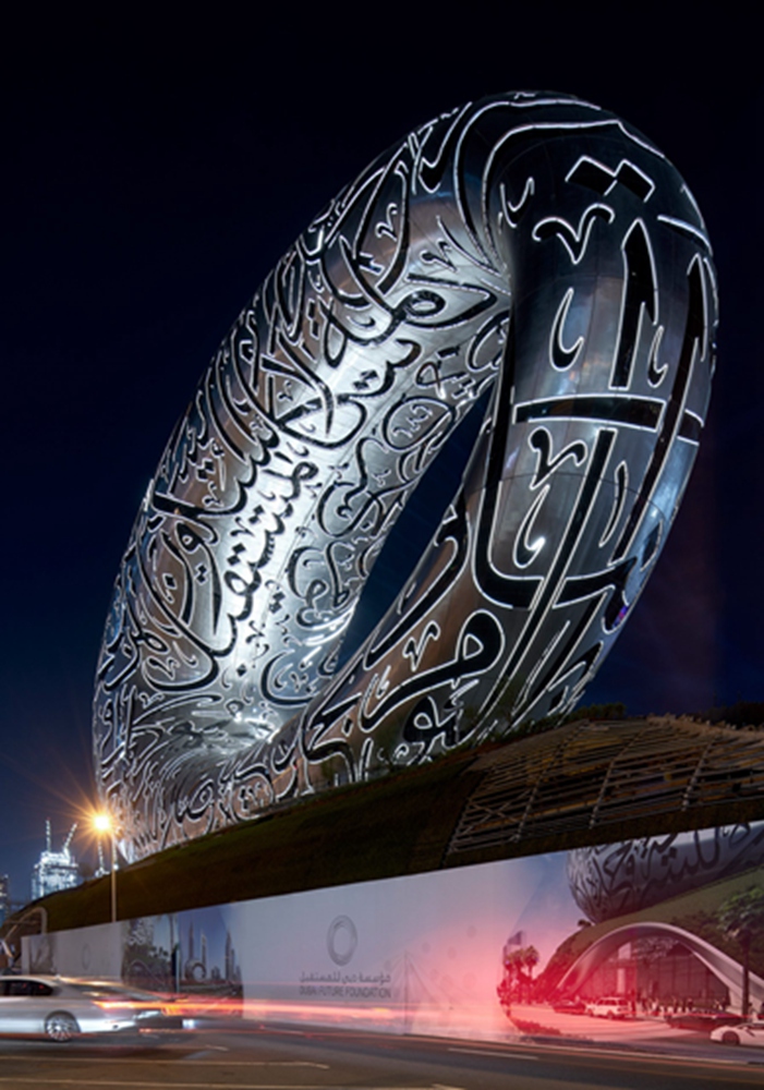 为迪拜未来基金会(Dubai Future Foundation)创建的未来博物馆将包含创新设计的展览,其设计具有代表迪拜政府对未来看法的动态形式。这座环形建筑位于迪拜高架铁路沿线,距离哈利法塔(Burj Khalifa)不远,它围绕着一个空洞形成了一个圆环,这个空洞是为了表达未知的知识。