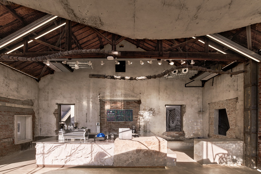 粗糙颗粒肌理漆包裹着原厂的旧砖,是当下时代的兼容,也是曾经历史的延续。过去的砖墙与现在产生联系,在平静的外表下,蓬勃粗犷最原始的生命力由此无声地张扬着。利用坚硬的材质塑造柔软的形态,与原本保留的木结构交汇。现代材料与老旧意境在同一空间内相互碰撞,包裹,融合,形成了交错于时空的对话。
