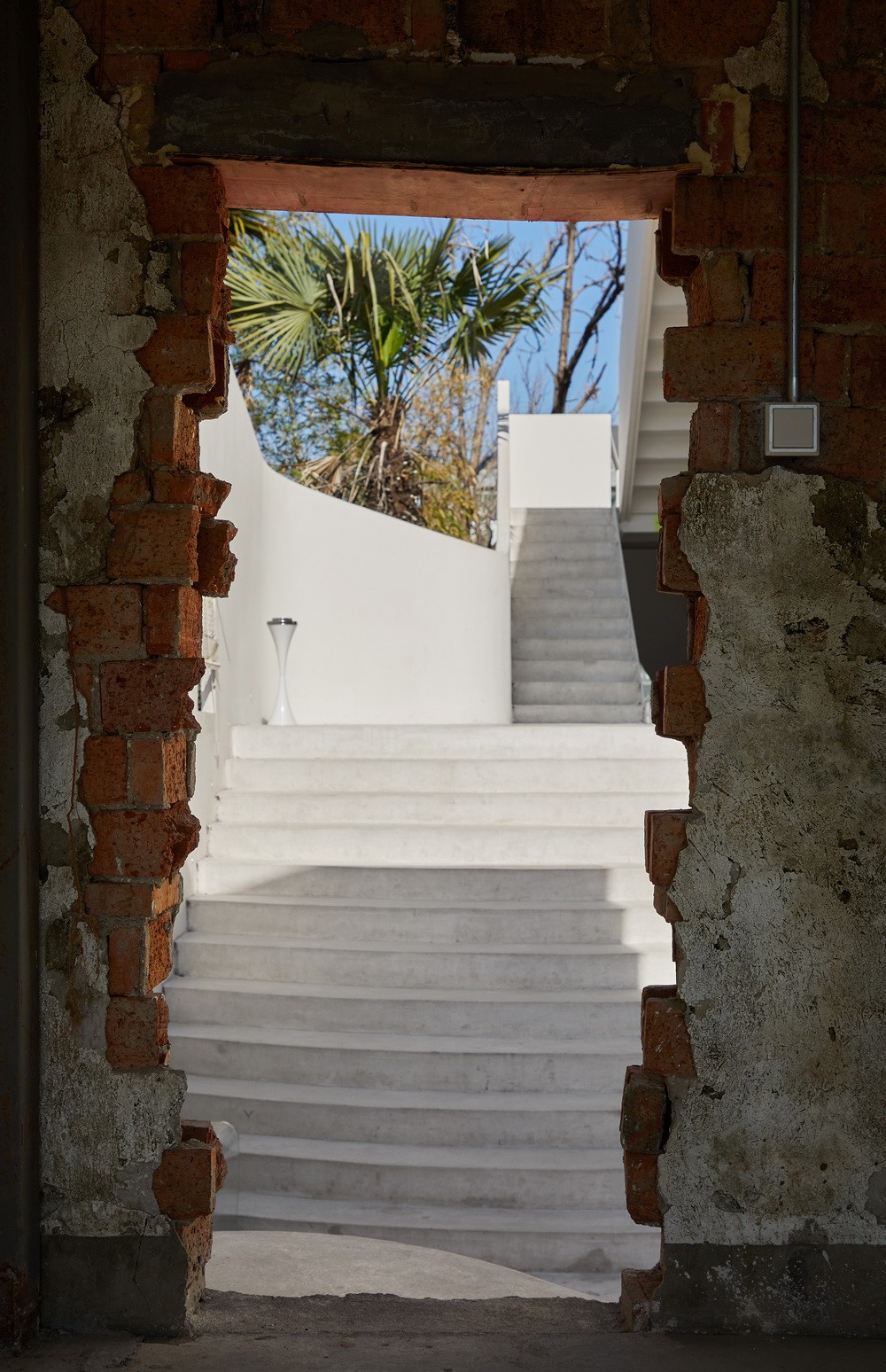 厂区的自来水塔作为双鱼不锈钢厂的标志保留了下来,楼梯以柔软的质感自上而下缓缓流淌。新与旧在此交汇,过去与现在建立联系,建筑之间对立融合的形态形成了独特的空间氛围。