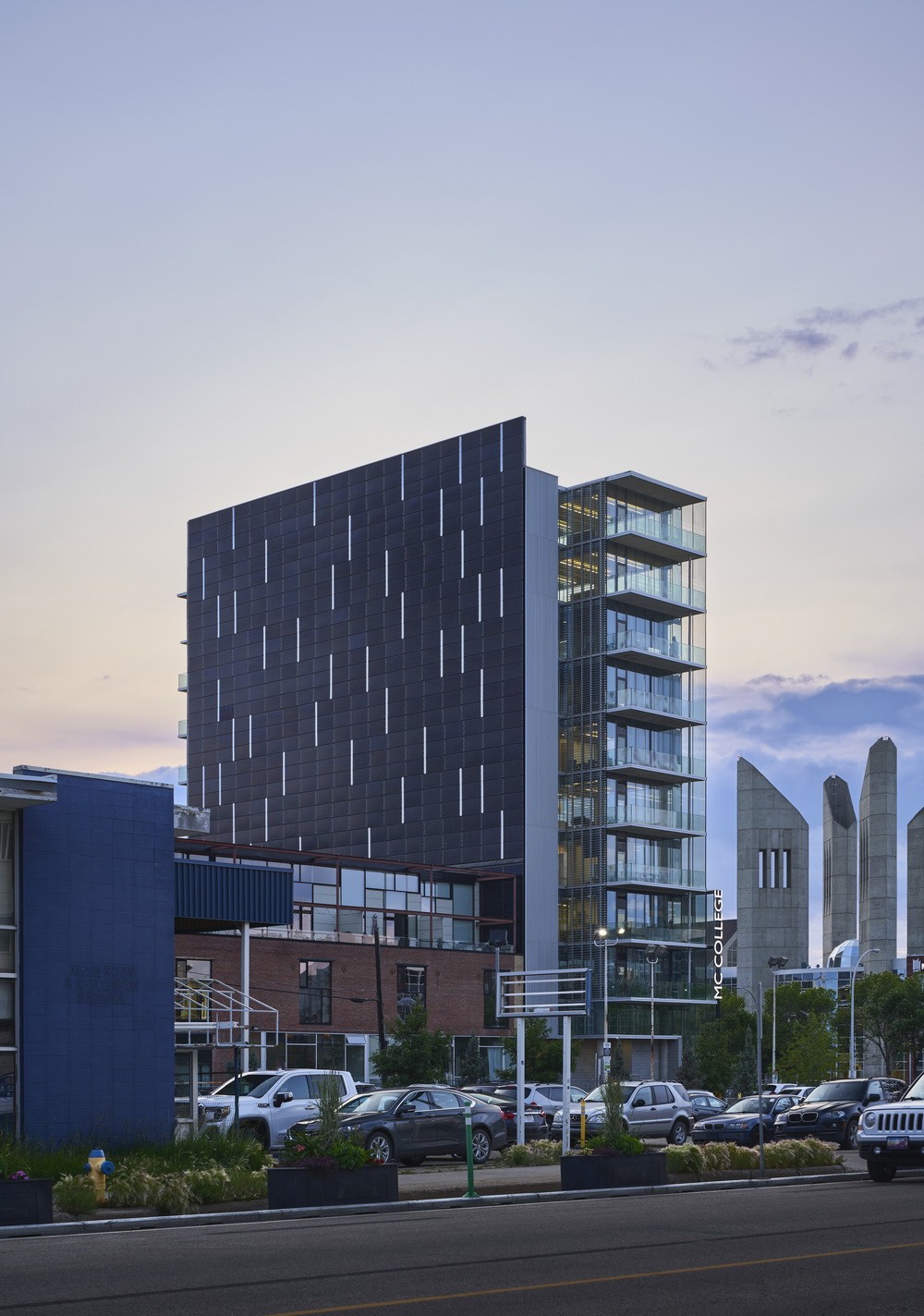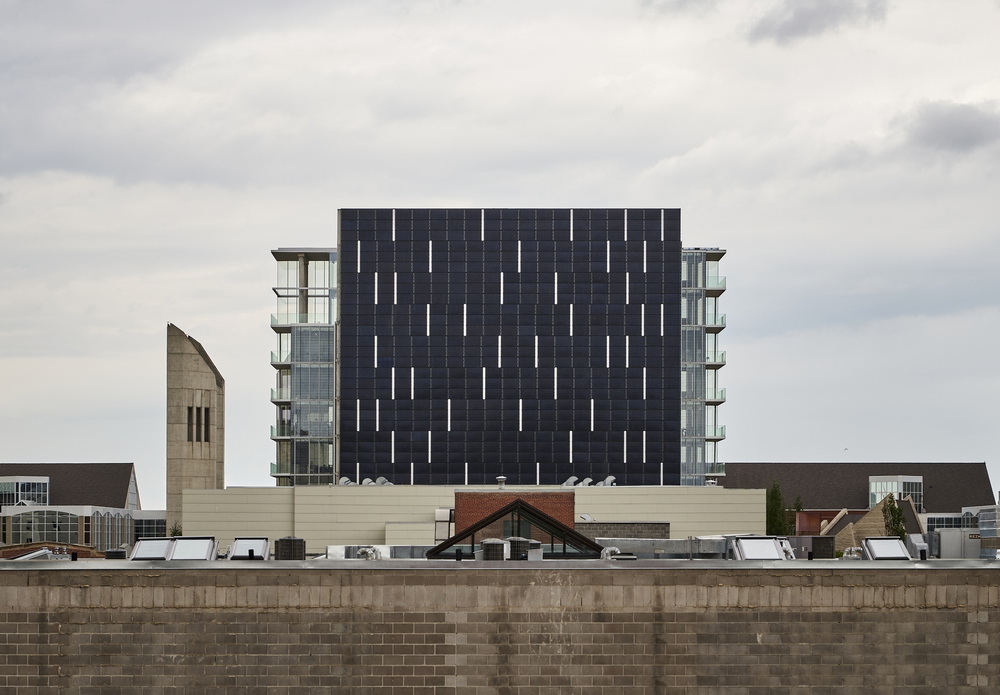 Edge办公楼建于一个宽为15米的地块上,共计10层,是目前加拿大拥有最大太阳能墙立面的建筑楼。该大楼立面560片的光伏电池板可满足建筑物80%的电力需求。同时,该大楼还与当地的城市电网相通,以转移其过剩的电能。大楼的设计包括了两种隔热的三层玻璃和四层玻璃系统。而北侧照射而来的日光也完全满足了白天室内照明的需求。北窗完全不需要安装任何的百叶窗来抵御夏季因阳光照射而产生的高温。办公楼的尾端还配有热隔离阳台和遮阳板,以更好地控制阳光照射。