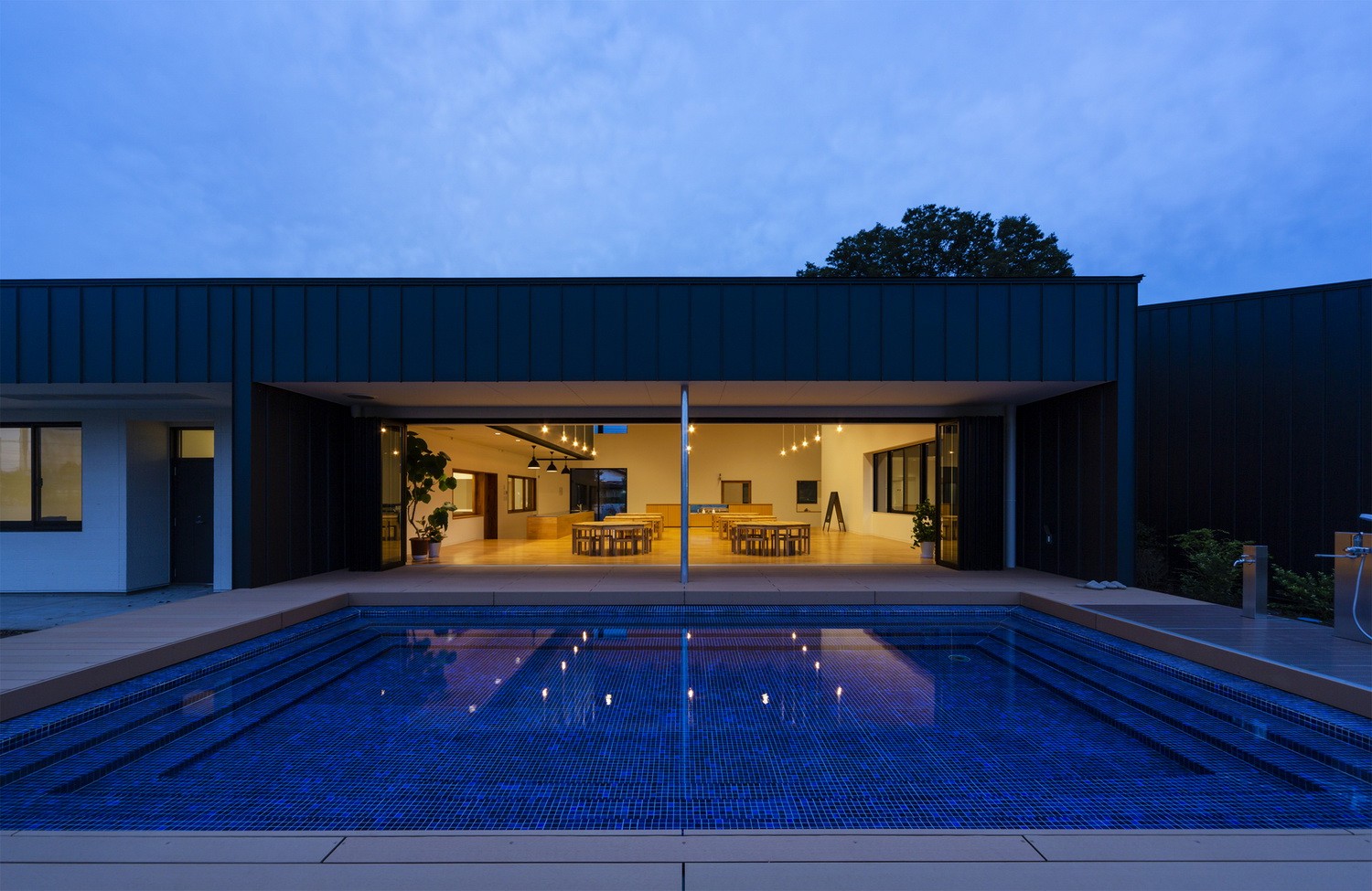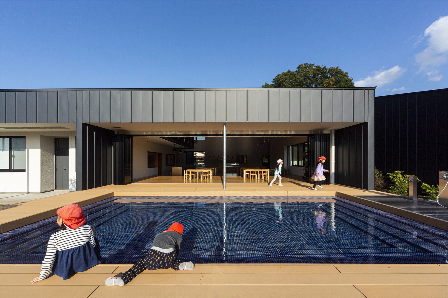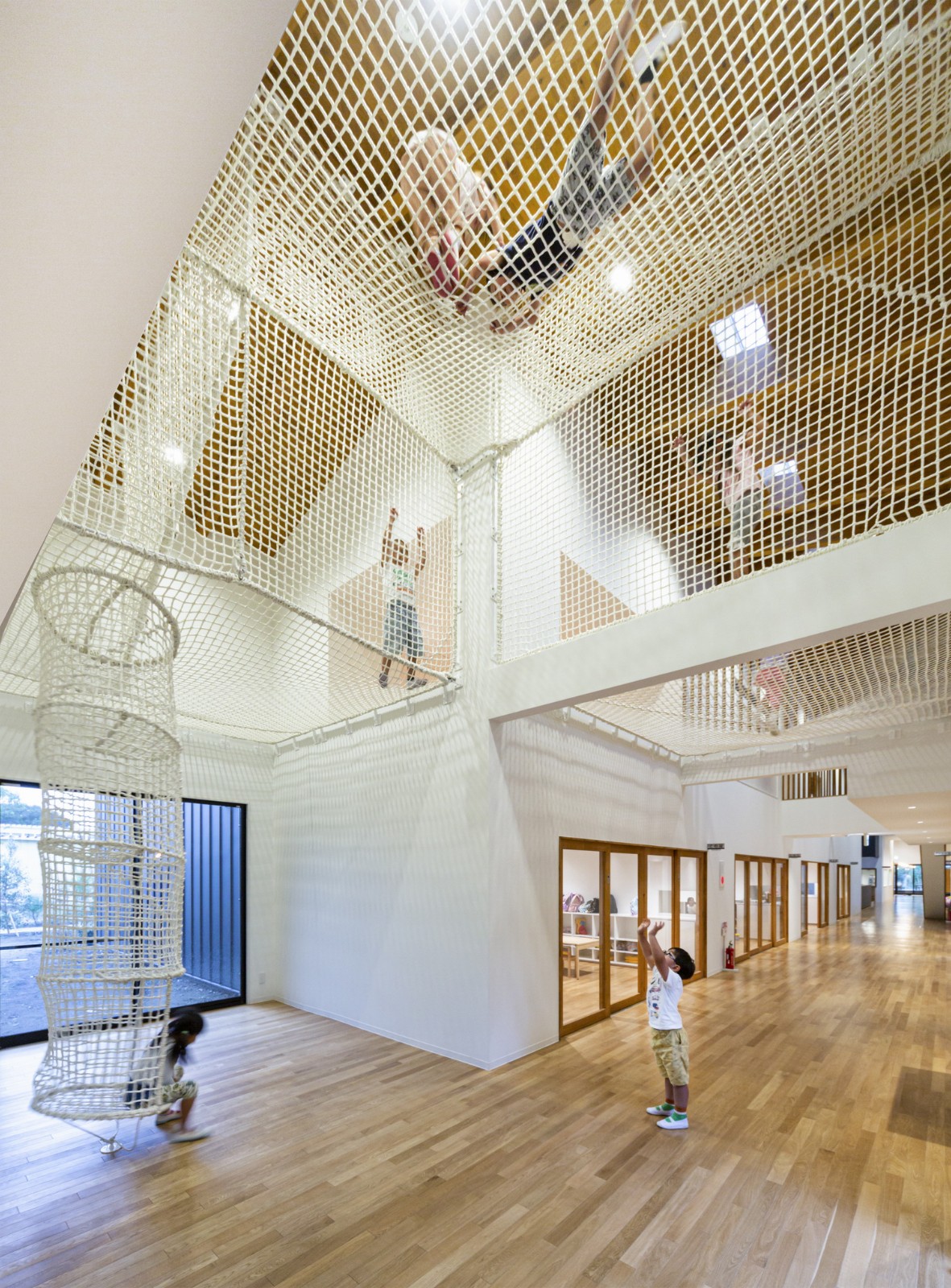 餐厅四周则都为落地窗,并以此与泳池露台互相连接。因此,光线和微风被自然地引入室内,而孩子们也可以像在大自然中一样享用午餐。建筑内还设有可以随意攀爬的立体网,让孩子们在玩乐中增强体能和平衡感。他们还可以在自然间的操场上跑来跑去,在游戏中锻炼身体。