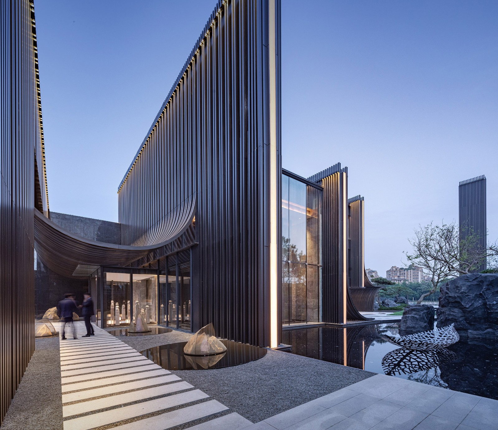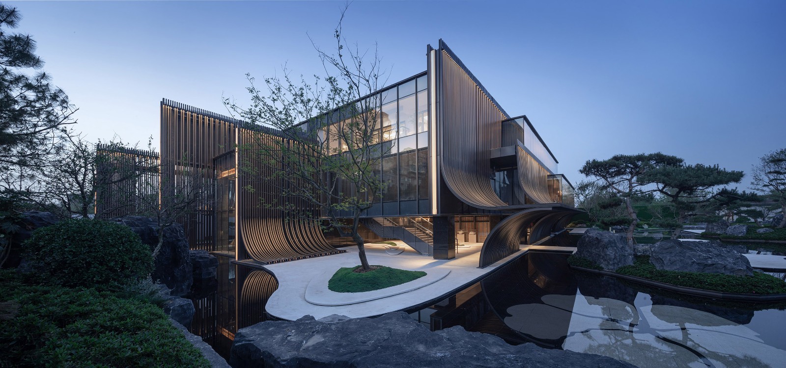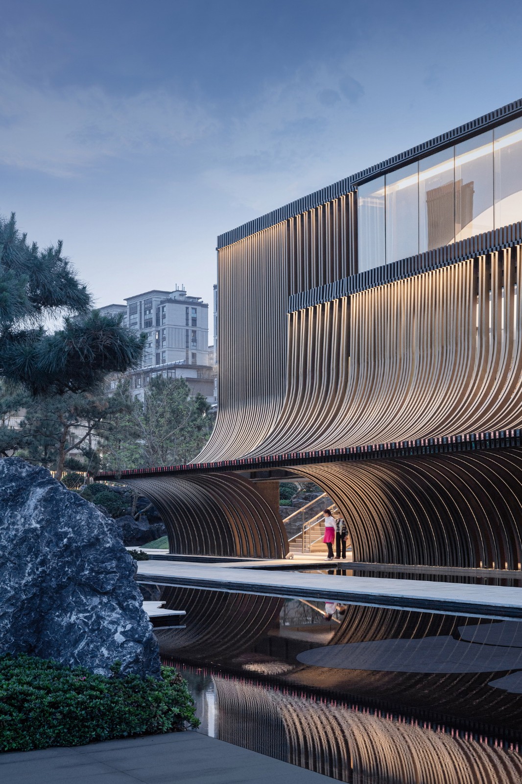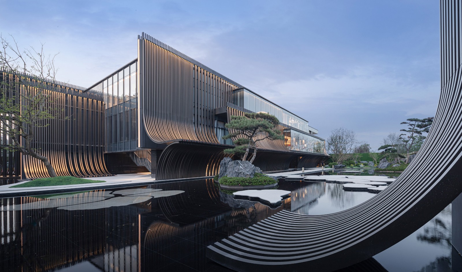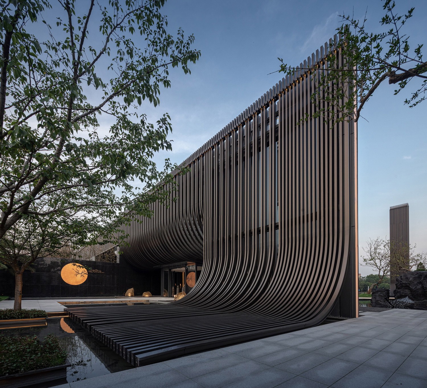 主立面由铝板格栅排列而成,通过重复的竖向线条,演绎出传统江南建筑的坡顶斜瓦。弧线元素在整体设计一以贯之,是构成整个建筑形象最重要特质的符号。建筑的灯光照明则尽可能地烘托建筑特色,形成强烈的韵律感。在夜幕降临,华灯初上,建筑仿佛又换了一幅模样,立于河畔。