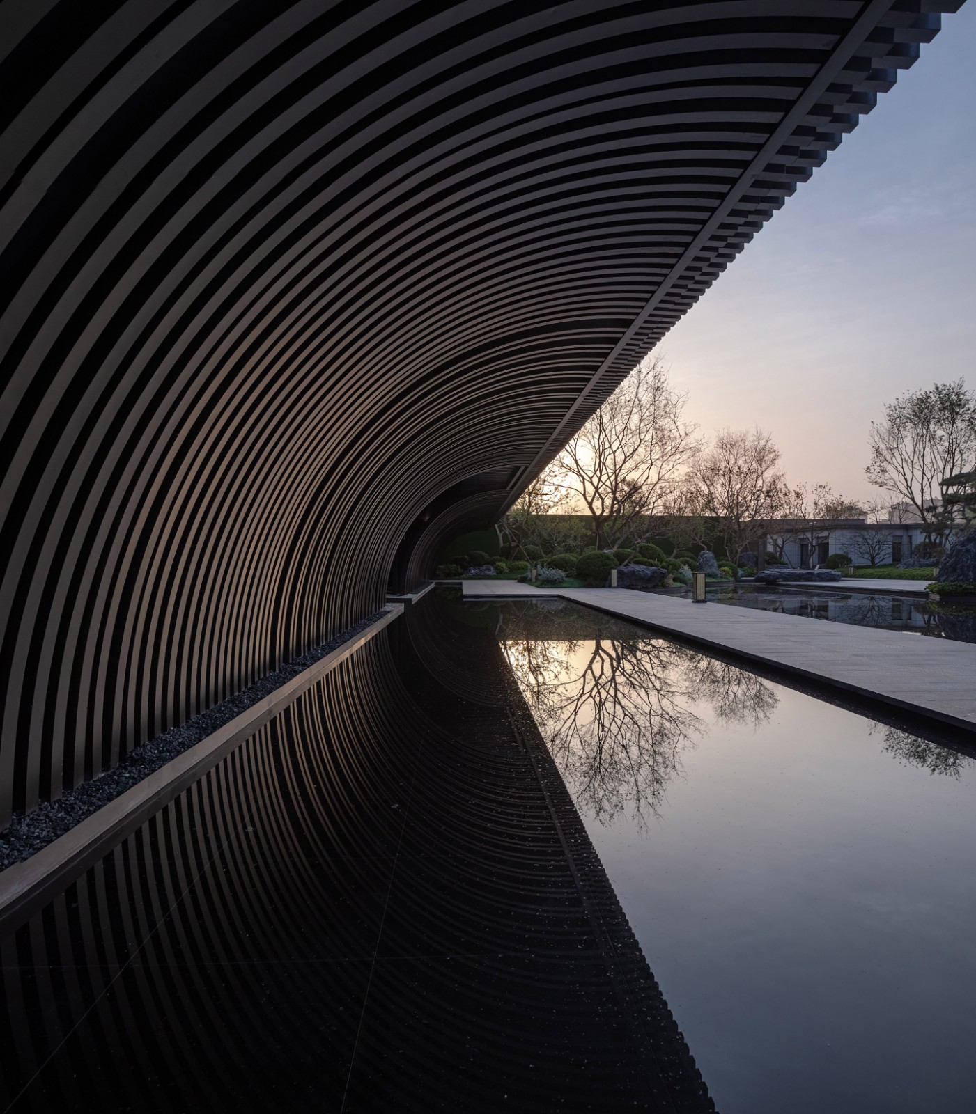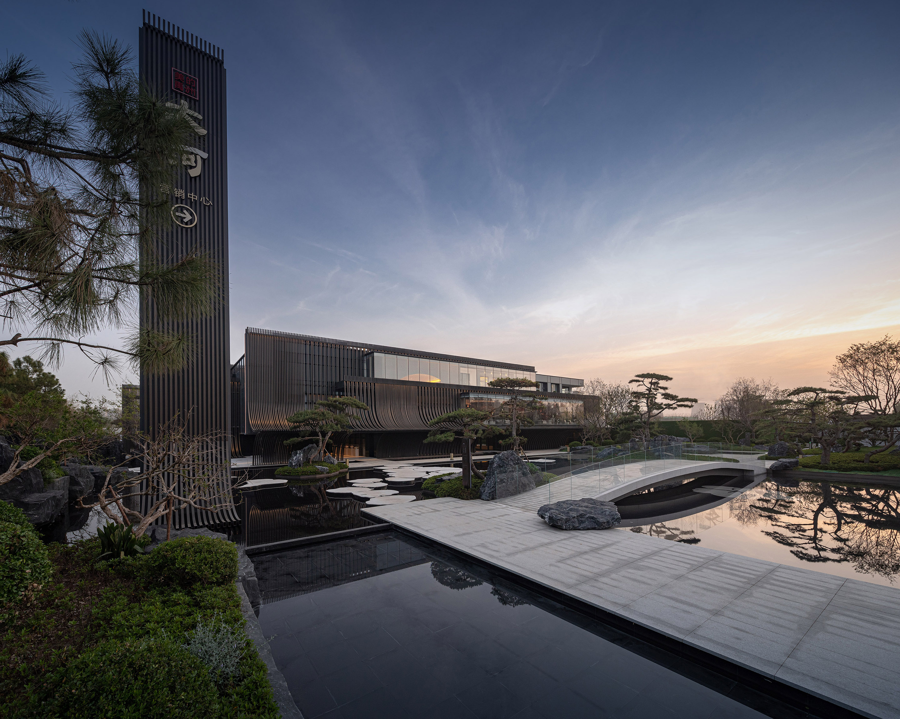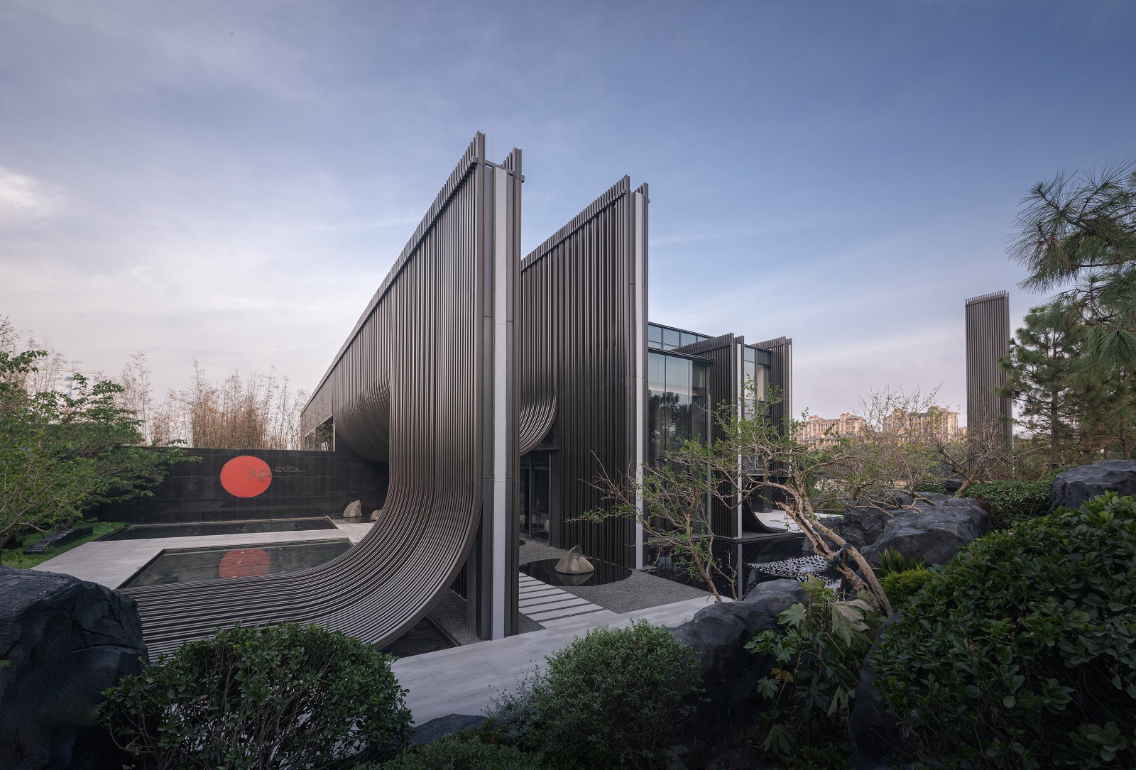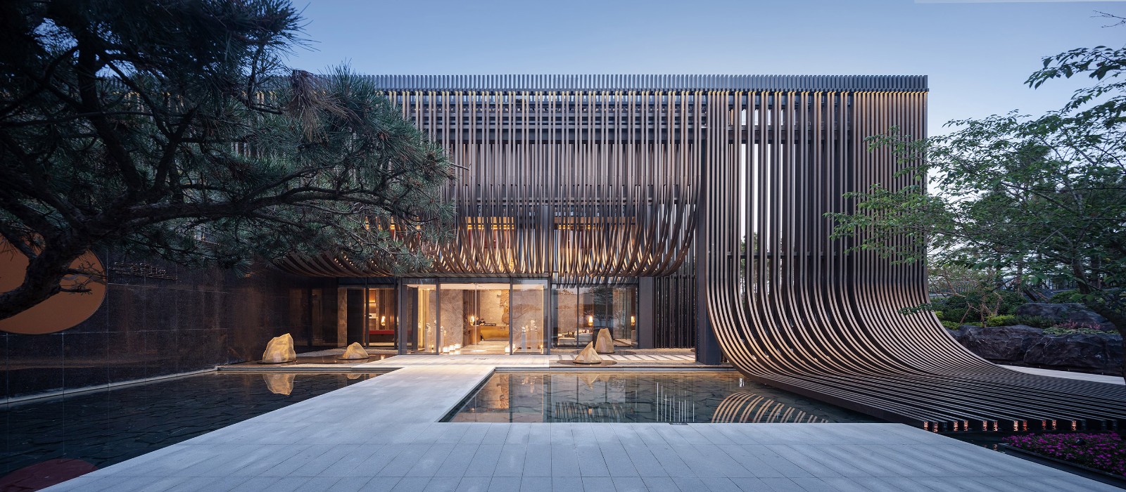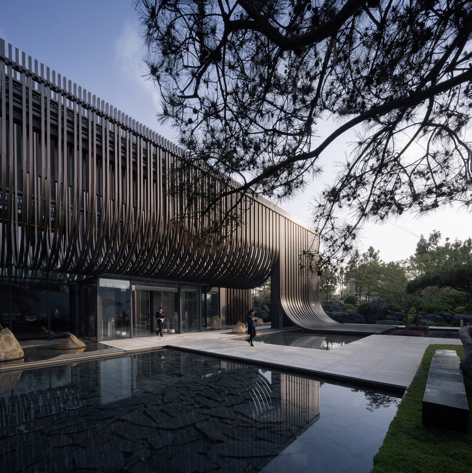 主立面由铝板格栅排列而成,通过重复的竖向线条,演绎出传统江南建筑的坡顶斜瓦。弧线元素在整体设计一以贯之,是构成整个建筑形象最重要特质的符号。建筑的灯光照明则尽可能地烘托建筑特色,形成强烈的韵律感。在夜幕降临,华灯初上,建筑仿佛又换了一幅模样,立于河畔。
